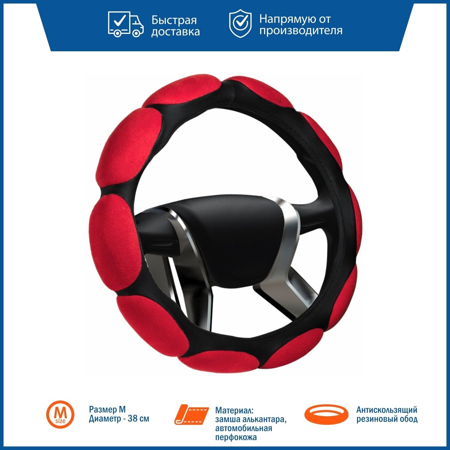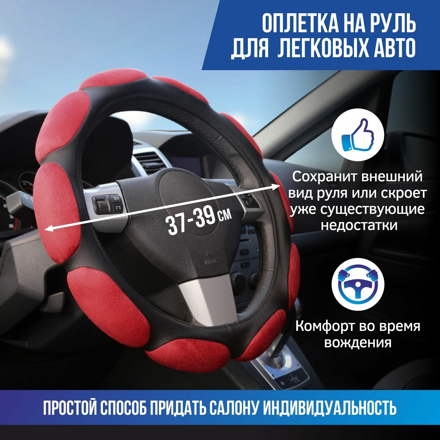 Оплетка предназначена для повышения эргономичности, эстетичного оформления и защиты рулевого колеса с внешним диаметром 37-38 см.