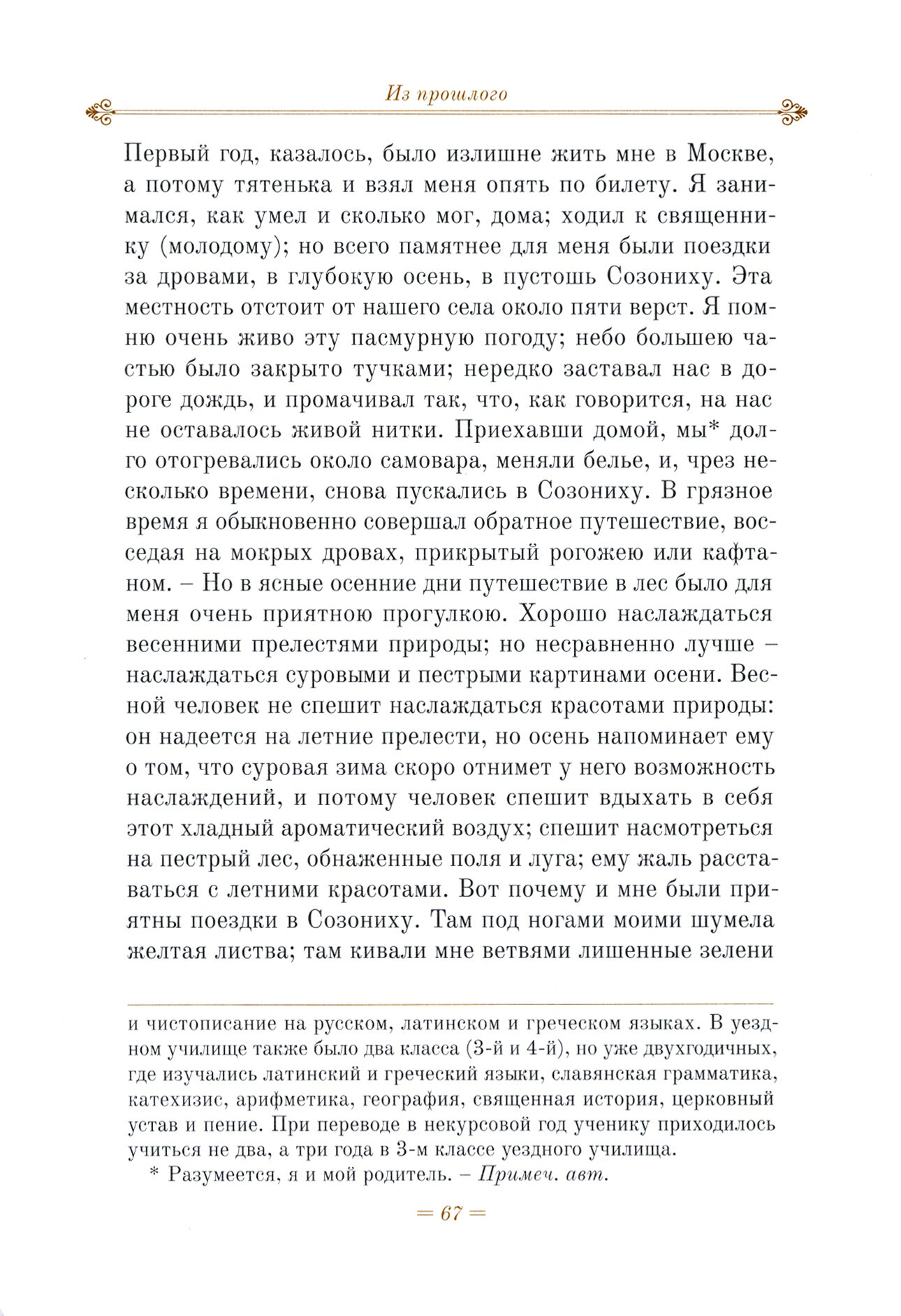Настоящий сборник воспоминаний юного Николая Рождественского (будущего архиепископа Никона) о начальных пятнадцати годах его жизни представляет собой мемуары, записанные им в первые четыре года, проведенные в Московской духовной семинарии (1868-1872). Семинарские записки владыки не только отражают реалии того времени, но и приоткрывают внутренний мир боголюбивой, покорной воле Божией души - сначала ребенка, а потом ученика духовных училищ. Издаваемые мемуары являются исключительно ценным источником для биографии архиепископа Никона и существенно пополняют сведения по истории Троицкого храма в селе Чашниково, Заиконоспасского и Перервинского духовных училищ, а молодому поколению могут послужить добрым примером для подражания.