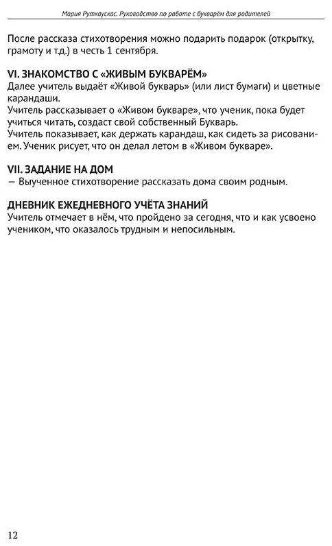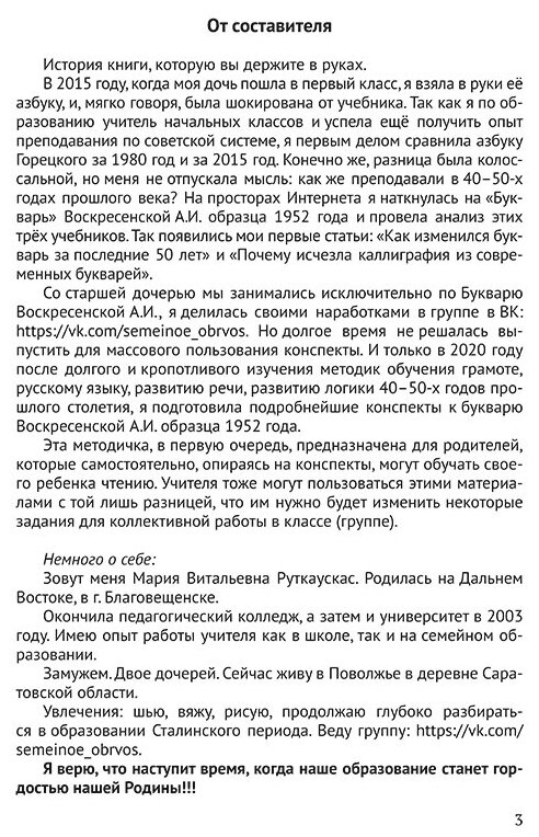 Как разучить с ребенком буквы и звуки и как познакомить его с основами письма? Какие задания ему дать для того, чтобы занятия по букварю были не только полезны, но и увлекательны? Какие материалы использовать во время урока и как спланировать его так, чтобы малыш не заскучал? Мария Руткаускас, учитель начальных классов, тщательно изучила советскую систему образования и подготовила подробный конспект занятий по известному "Букварю" А.И. Воскресенской, педагога и методиста по русскому языку. "Руководство" разделено на 70 уроков с детальными планами занятий, подборками вопросов и советами по тому, как с помощью наглядных материалов увлечь дошкольников и детей младшего школьного возраста чтением и письмом. Книга будет полезна как родителям, так и учителям начальных классов.