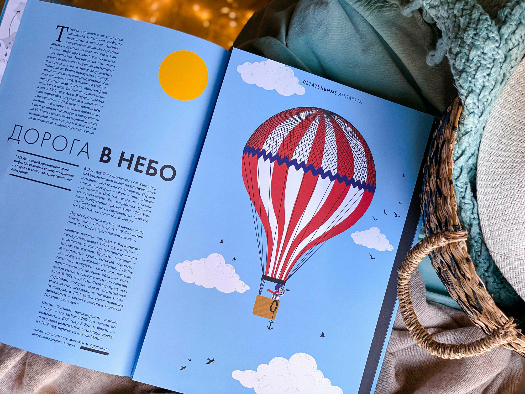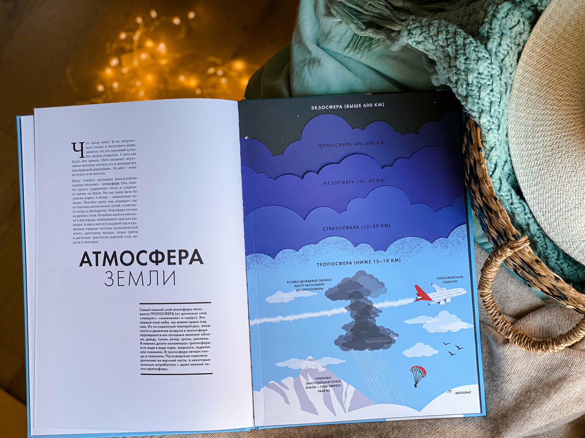 Интерактивная книга с клапанами и резными иллюстрациями про атмосферу, космос, воздухоплавание, птиц и не только