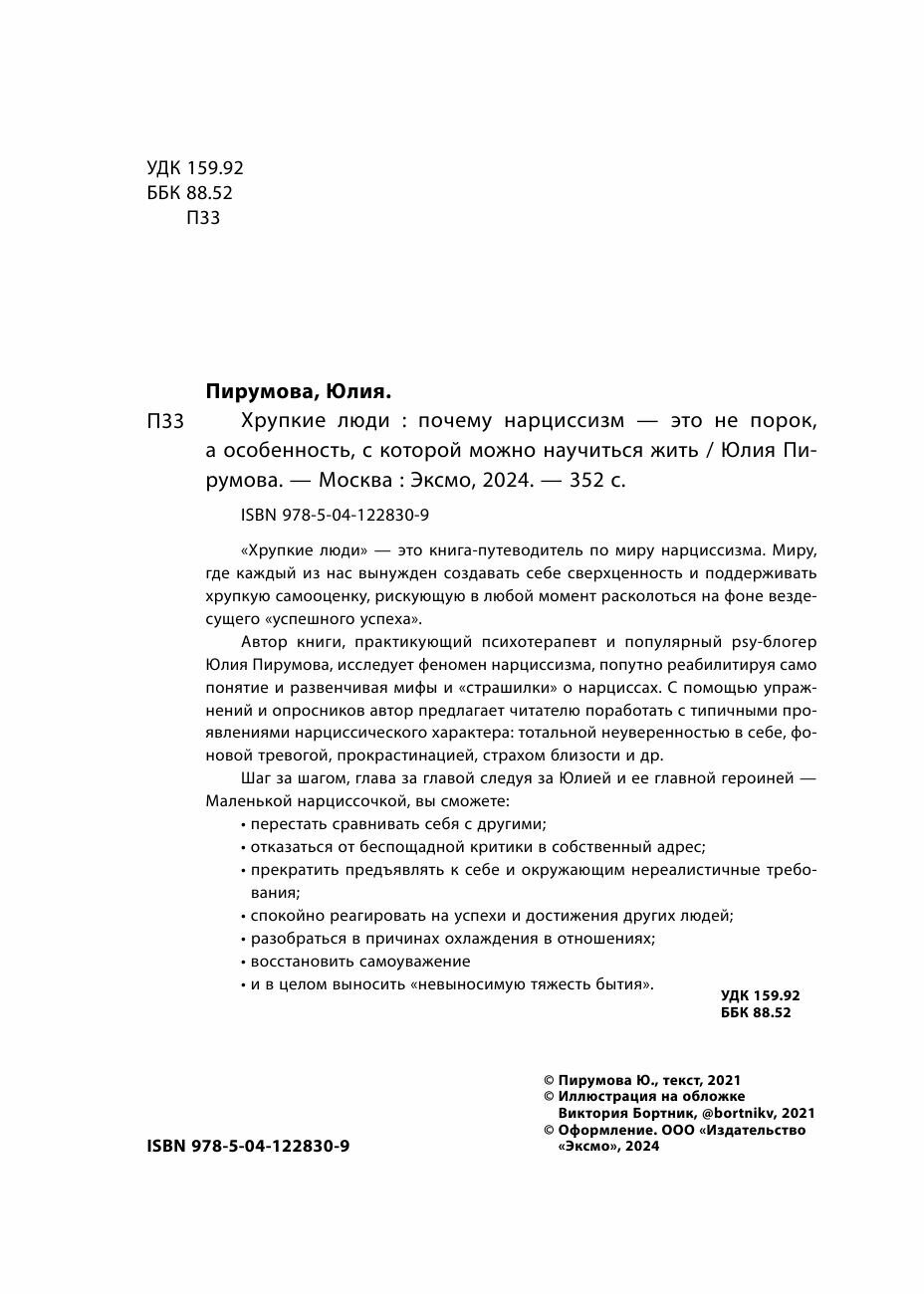 Хрупкие люди. Почему нарциссизм - это не порок а особенность с которой можно научиться жить (новое оформление) (Пирумова Юлия); ООО "Издательство "Эксмо", 2021