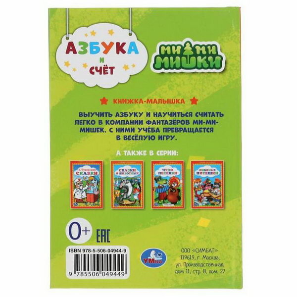 Малыш с удовольствием будет учить буквы и цифры вместе с персонажами любимого мультфильма. Весёлые стихи, яркие картинки и фантазёры Ми-ми-мишки превратят обучение в увлекательную игру. Благодаря удобному формату книжку-малышку легко взять с собой в дорогу.