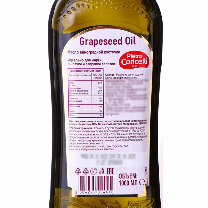 Масло виноградное Pietro Coricelli, 500 мл. Масло виноградное Pietro Coricelli, полученное из виноградных косточек, обладает мягким, чуть сладковатым вкусом, и прекрасно подходит для маринования рыбы и мяса, заправки салатов и сыров. Благодаря высокой температуре дымления идеально и для жарки. Масло виноградной косточки богато ненасыщенными жирными кислотами, полезно для здоровья, а также красоты - его применяют для приготовления масок и скрабов для кожи.(8097875)