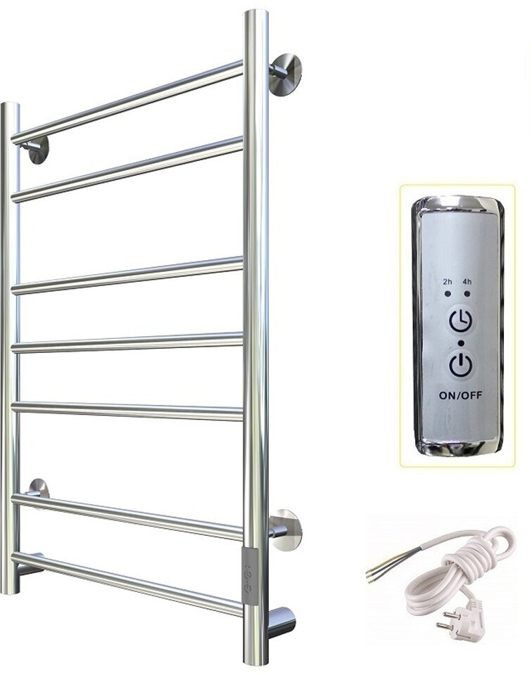 Изделие производится из нержавеющей стали AISI 201. Вертикальные трубы d -32 мм., для горизонтальных вставок используется труба d 18 мм. Нагревательным элементом в полотенцесушителе является греющий кабель аналог теплого пола, кабель заправляется внутрь каждой трубы и передает тепло на поверхность изделия. Во включенном состоянии постоянно поддерживается температура 50-600. Экономичность: Полотенцесушитель снабжен панелью управления. Кнопка включения/выключения и таймер на 2 часа и 4 часа , который позволяет включать изделие на ограниченное время. Эта функция дает возможность экономить электричество. Мощность электрического прибора порядка 60W при стоимости 1 кВт 5 руб несложно посчитать: 60W х 24 = 1,5 кВт в сутки. Стоимость эксплуатации изделия за сутки 1,5 кВт х 5 руб. = 7,5 руб. Максимальный расход электричества за месяц примерно 225 руб. При условии если сушка работает круглосуточно. Удобство монтажа: Полотенцесушитель крепится к стене на четыре держателя. Универсальное исполнение изделия позволяет подключить его, как справа, так и слева. Скрытое подключение: Благодаря приваренным в нижней части вертикальных труб двум распаячным коробкам, в которых соединяется электропроводка, возможно скрытое подключение к электричеству слева и справа. Подключение в розетку: В комплекте также имеется шнур с вилкой, который будет необходим при подключении к розетке.