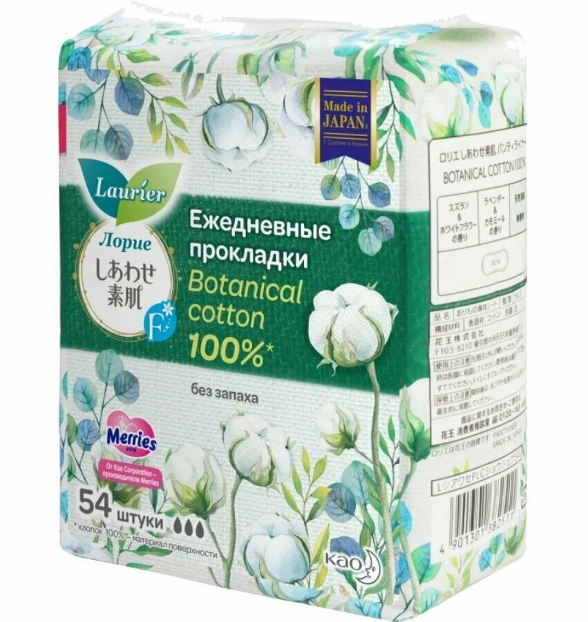 Одна флоу-упаковка Laurier F Botanical Cotton содержит 54 прокладки и заменит примерно 3 стандартные упаковки более дешёвых прокладок на каждый день. Длина каждой прокладки – 14 см. Со средствами личной гигиены для женщин Laurier (Лорие) вы будете чувствовать себя свободной, защищённой и уверенной в любой день. Позаботьтесь о важном, а о вас позаботится Laurier.
