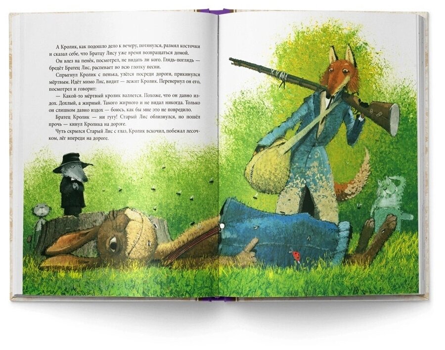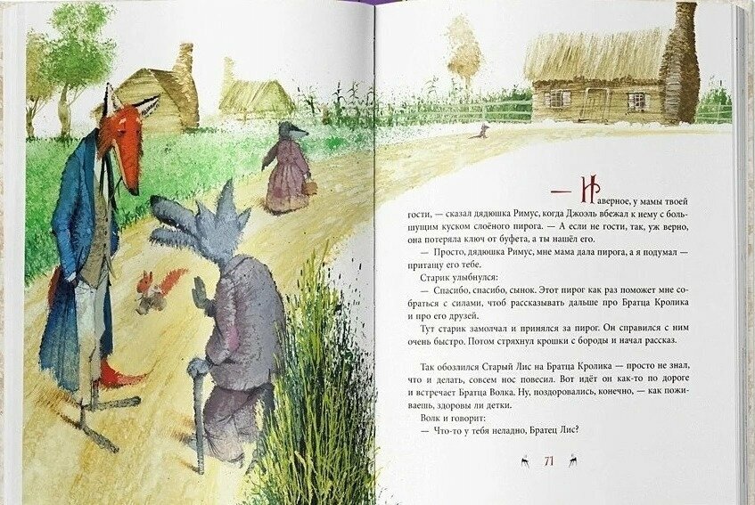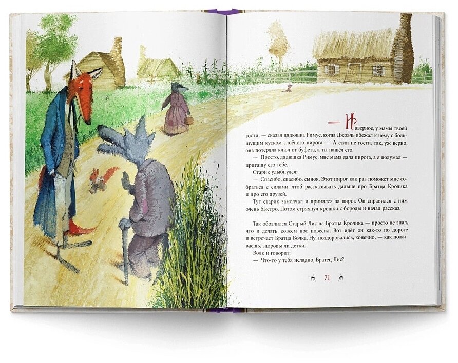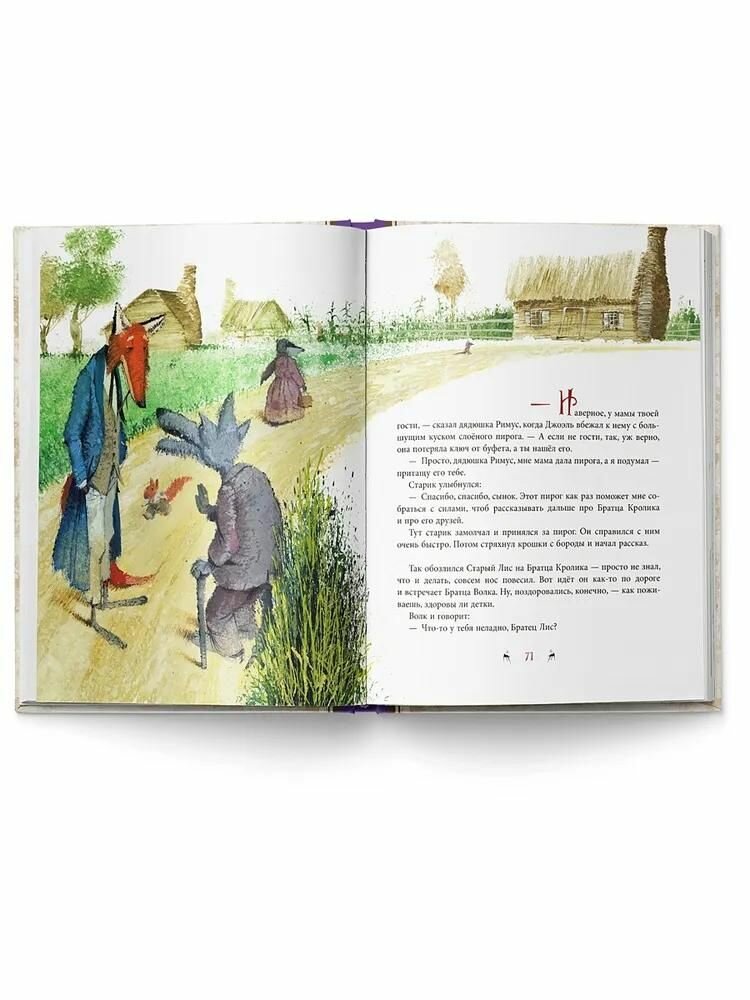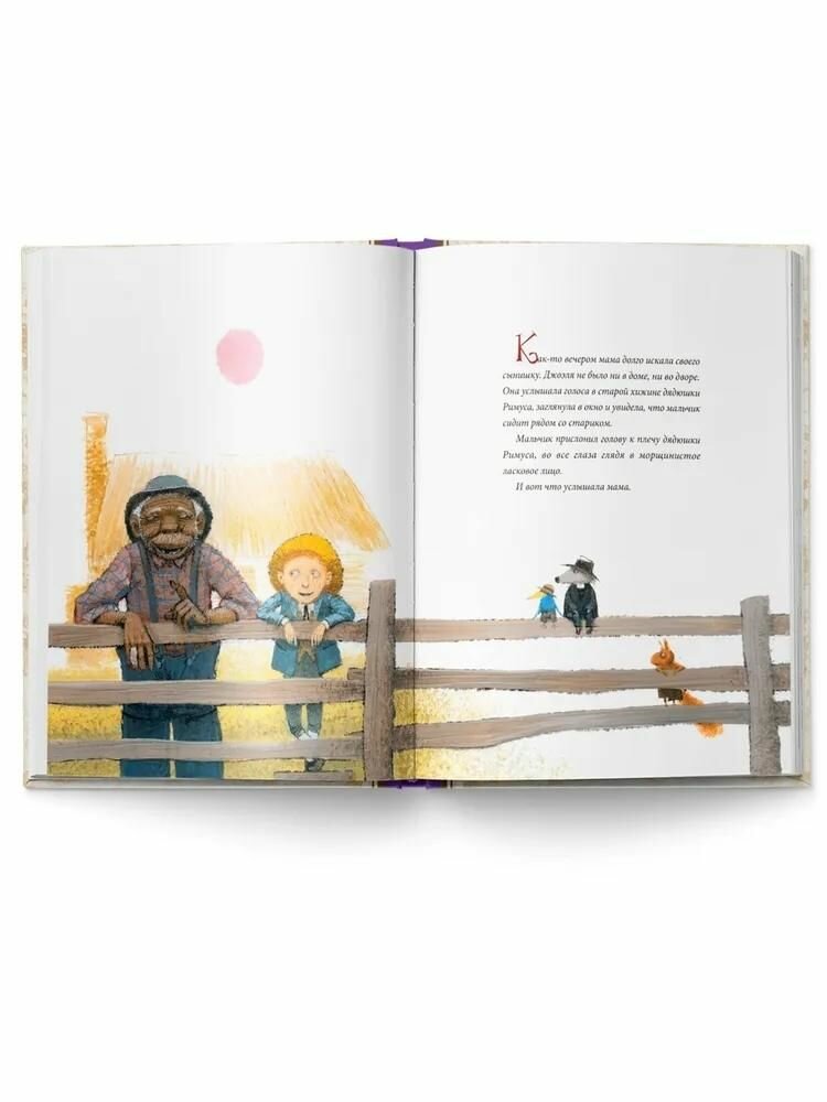Хорошая книга, на плотной меловке, очень качественная бумага, матовая. Рисунки на такой бумаге яркие, красочные. Рисунки очень подходят к сказкам, жаль, что художника не хватило на остальные тексты. Всего меньше половины классических сказок вошли в сборник. В книге нет сказки про лошадь братца Кролика, нет про то, как лис посадил горох, про хвост братца Кролика, про соревнования Кролика и Черепахи и других интересных. Сказки здесь идут не по обычному порядку, поэтому могут быть несовпадения в повествовании. Но в целом рисунки хорошие, веселые. Персонажи немного своеобразные.