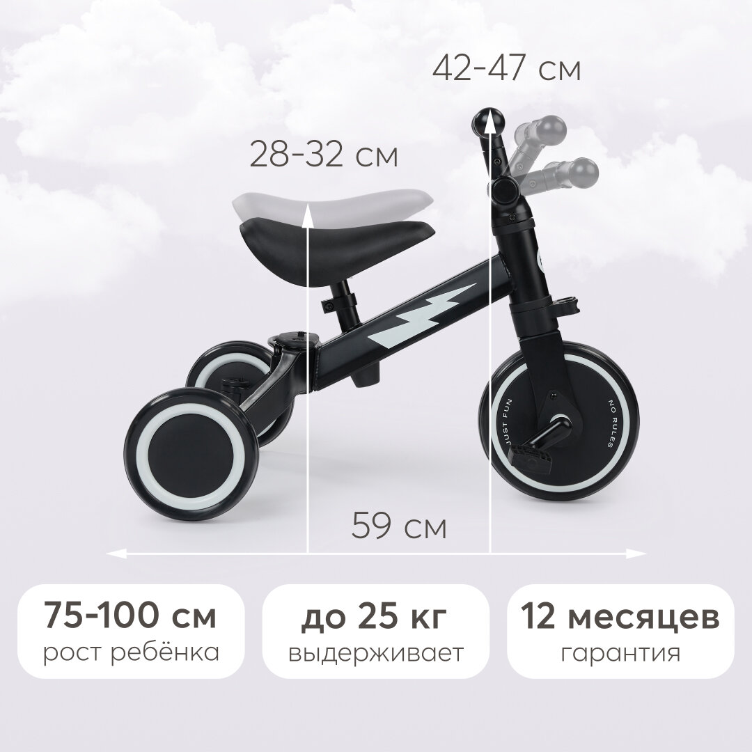 У ADVENTURE 3 варианта трансформации: трёхколёсный беговел, двухколёсный беговел, трёхколёсный велосипед. Идеальный первый транспорт для детей от 1 до 3 лет. Сиденье регулируется по высоте, а у руля с удобными прорезиненными ручками 2 угла наклона – просто настроить под рост ребёнка. Для безопасности при высоких скоростях поворот переднего колеса ограничен 30 градусами. Механизм трансформации прост и надёжен: фиксаторы металлические, есть защита от произвольного складывания. Каркас беговела сделан из металл
