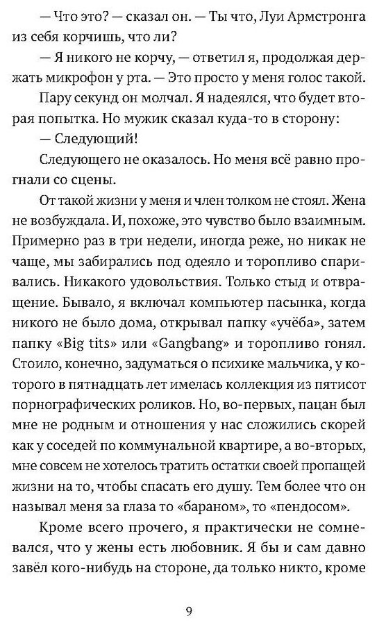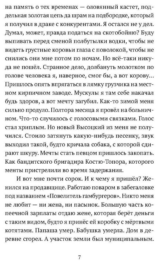 Начало книги Кирилла Рябова умопомрачительно хорошо. Вот этой мгновенной вспышкой надежды, которая освещает глупую никчемную жизнь Игорька, который мечтал стать певцом, в то время, как папаша видел его в роли забойщика скота: "дадут тебе кувалду, фартук, сапоги, пустят навстречу стаду коров, а ты знай - лупи их промеж рогов". А теперь он ни то, ни се - возраст под сорок, повар в сетевой забегаловке, жарит бургеры за десять тысяч в месяц, жена с пасынком за человека не считают, одет как обсос.