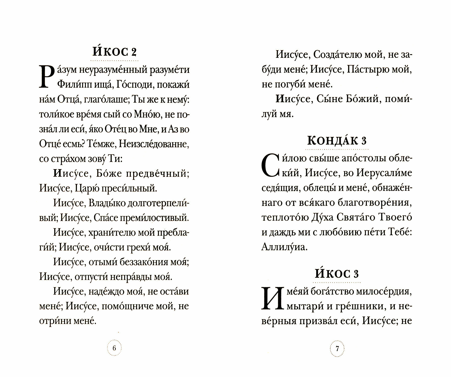 Приведен полный акафист Иисусу Сладчайшему на церковнославянском языке, с ударениями. Шрифт очень крупный, поля широкие, можно подписать значение слов или заметки. В конце напечатана черно-белая фотография иконы Андрея Рублева «Спас Звенигородский из деисусного чина».