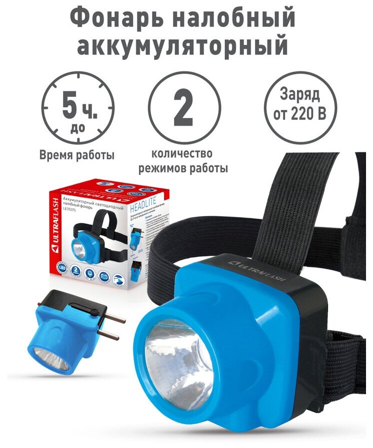 Фонарь налобный Ultraflash голубой/черный, источник света светодиодный блок х 1шт, питание от аккумулятора (14252)