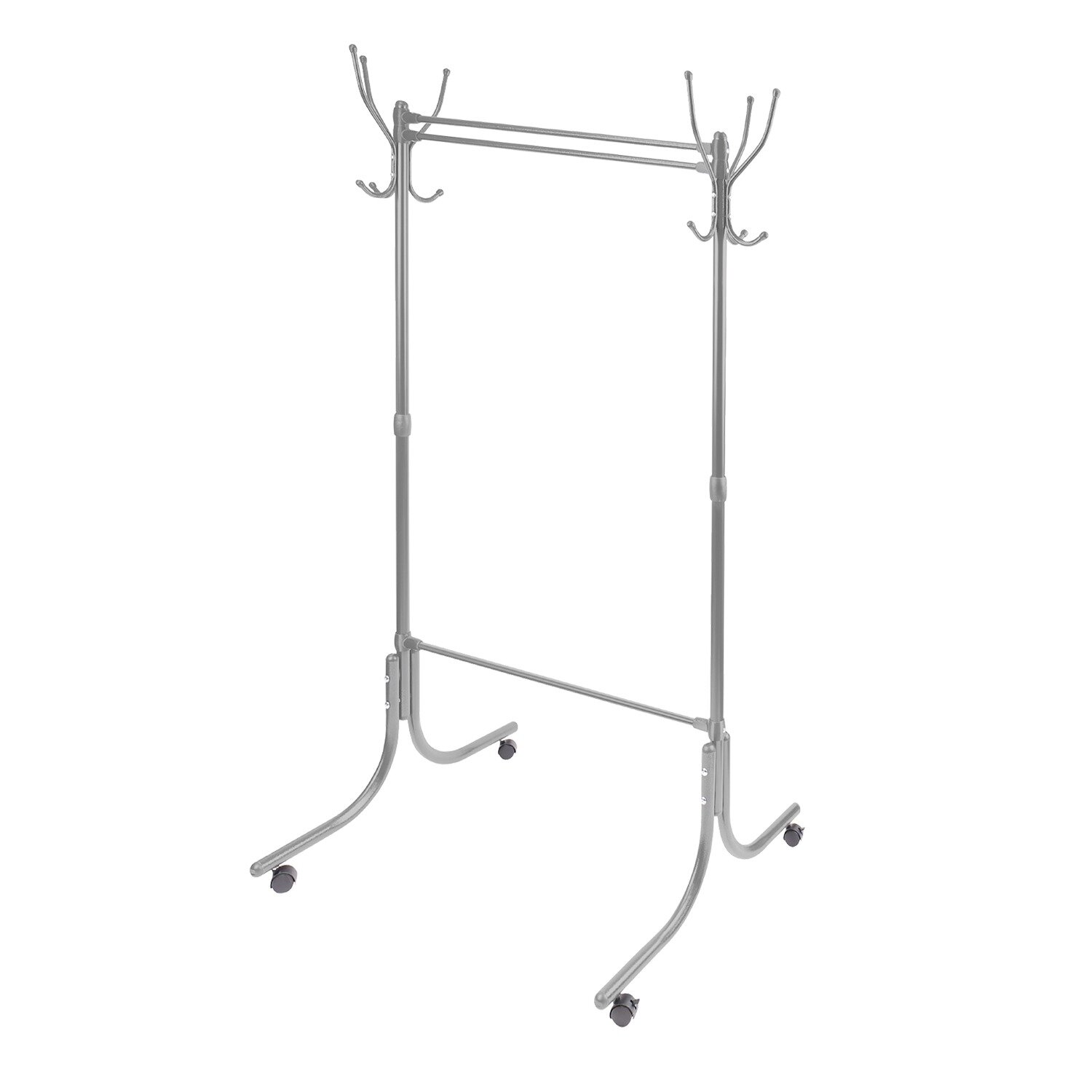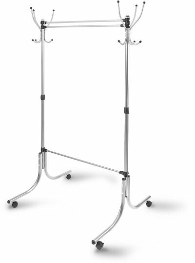 Изящная, стильная и функциональная вешалка станет хорошей покупкой для Вашего дома. Каркас изделия выполнен из стали и покрыт порошковой полимерной краской, которая защищает конструкцию от нежелательного воздействия коррозии. Для дополнительного удобства есть колесики, с помощью которых можно переместить изделие в желаемое для Вас место.