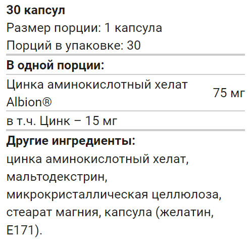 | Состав | бисглицинат цинка (хелат цинка аминокислотный Albion), наполнитель - микрокристаллическая целлюлоза, мальтодекстрин, антислеживающий агент - магниевые соли жирных кислот, капсула (желатин, краситель:Е171) |