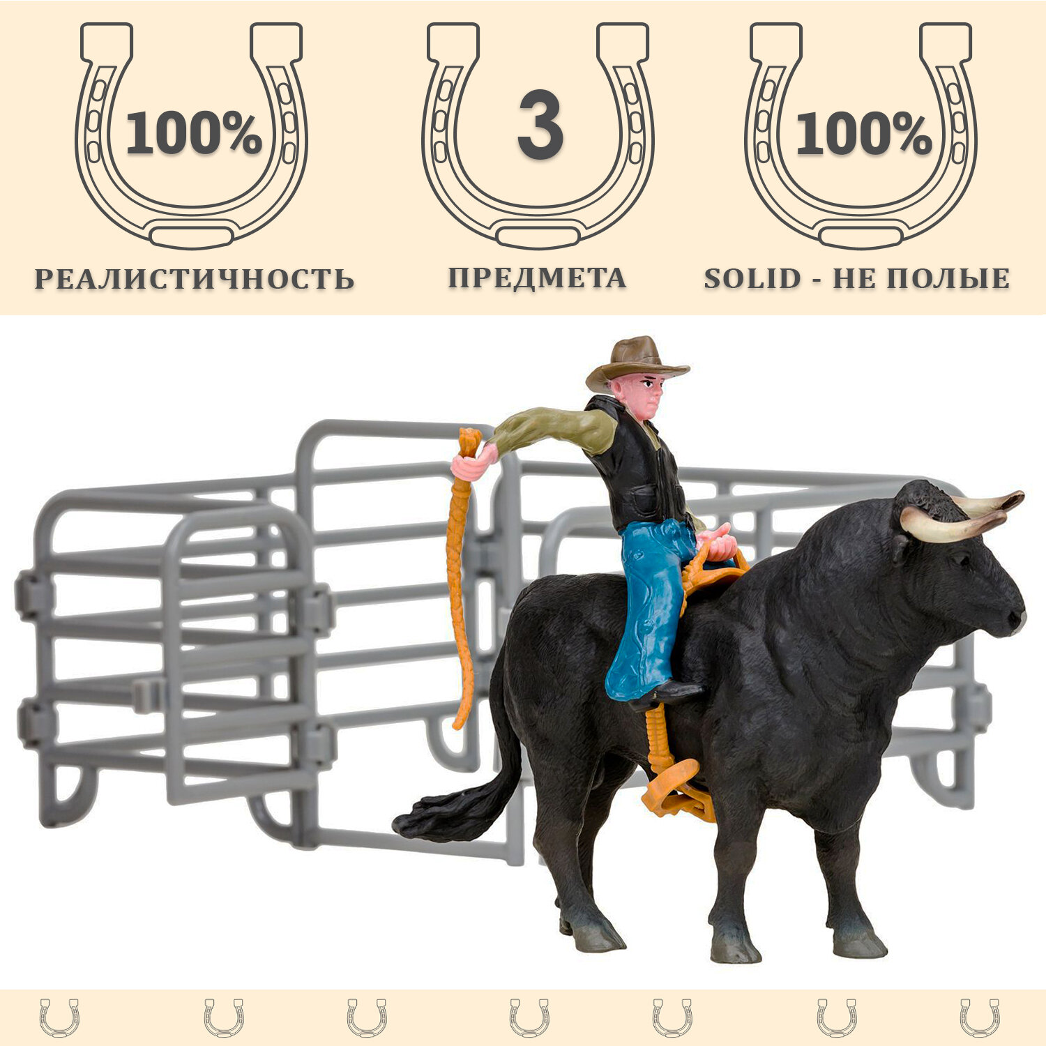 • В комплект входит 3 предмета:ковбой (8х3х3 см), бык (18x4x9,5 см), загон (10х15х15 см).