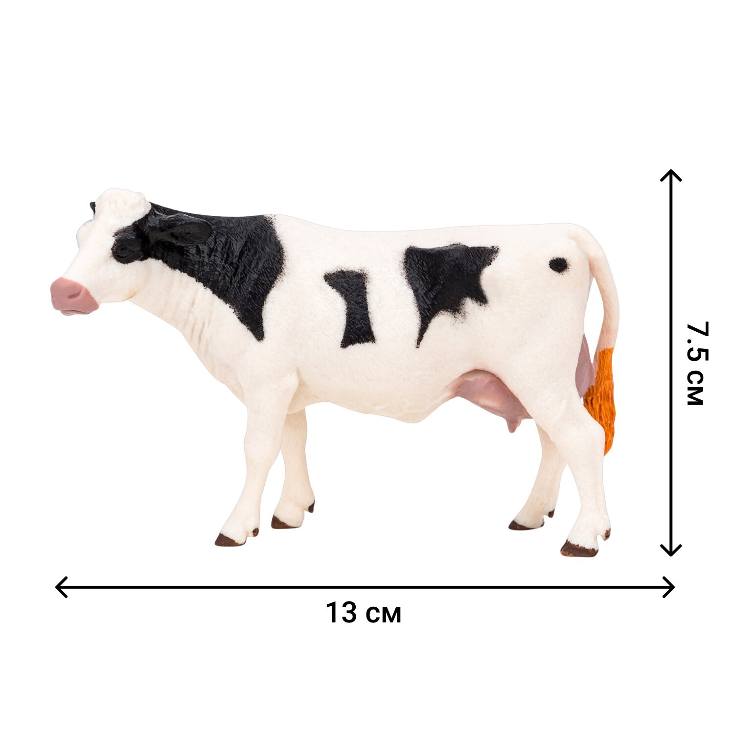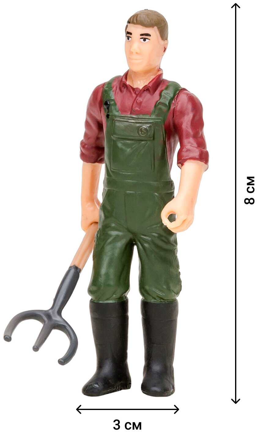 • В комплект входит 6 предметов: корова (13x5,5x7,5 см), фермер (8х3х3 см), загон (10х15х15 см), вилы (5х2х0,5 см), трава (3х2х2 см), мешок (3,5х3х2 см).