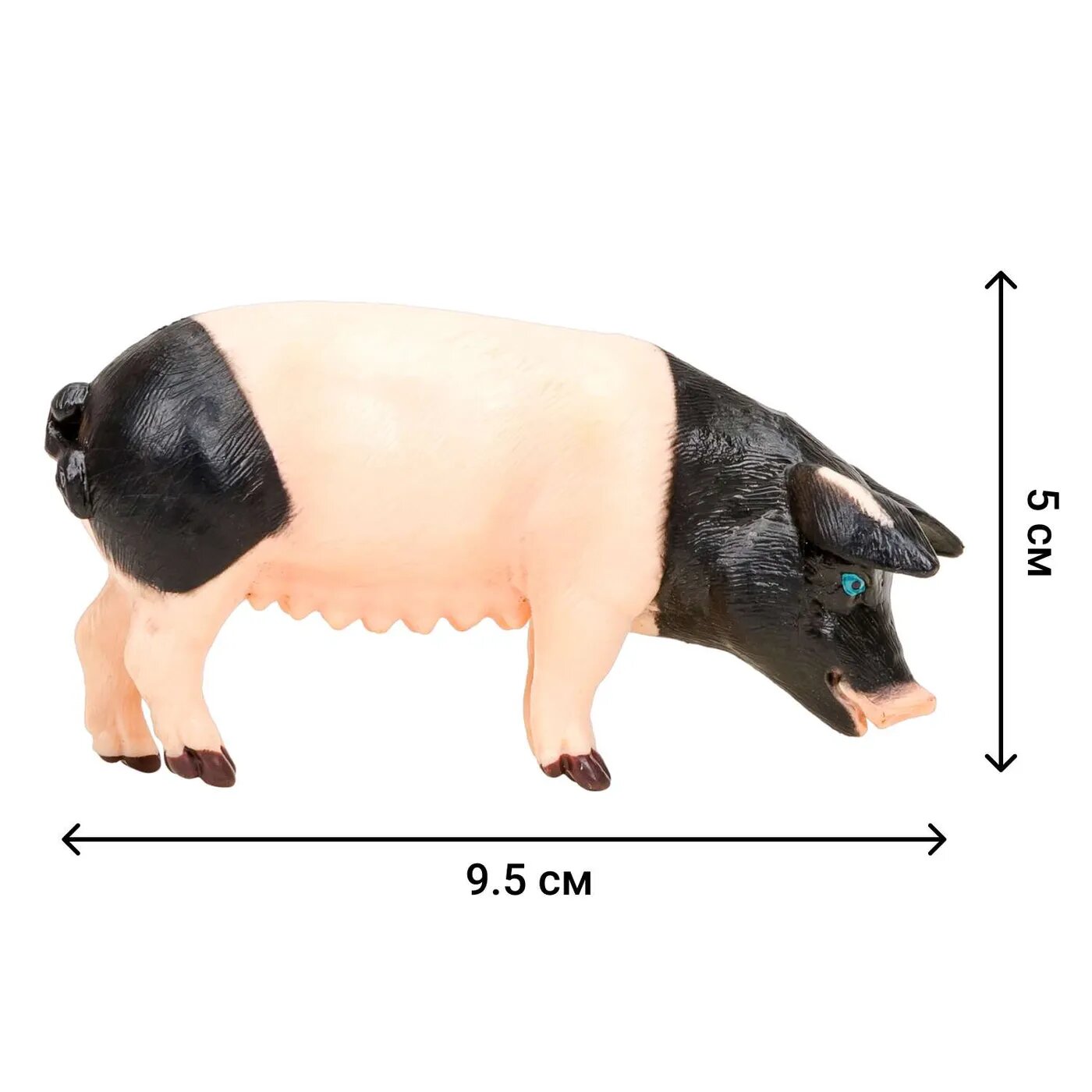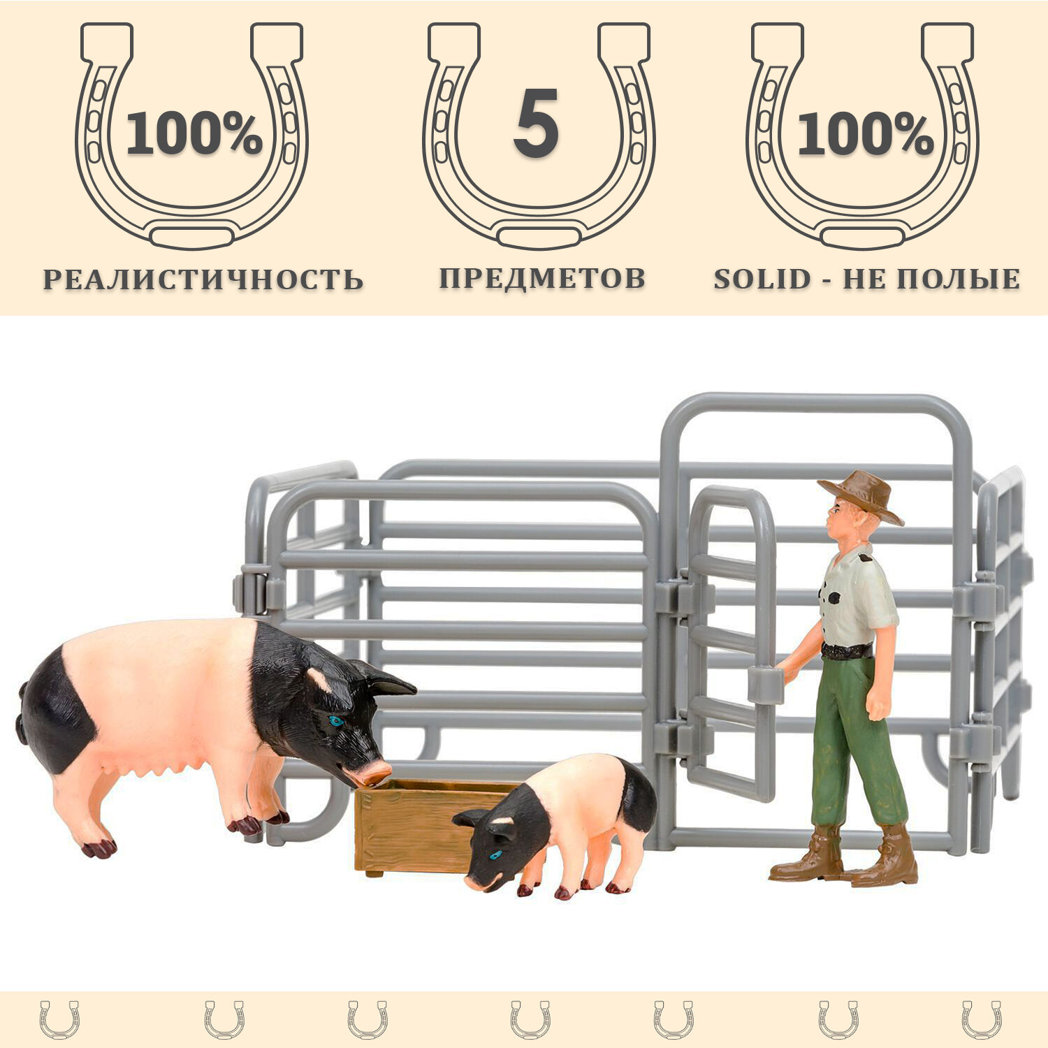 • В комплект входит 5 предметов: свинья ( 9,5x3x5 см), поросенок (5х1,5х3 см), фермер (8х3х3 см), загон (10х15х15 см) , ящик (4х3,5х2 см).