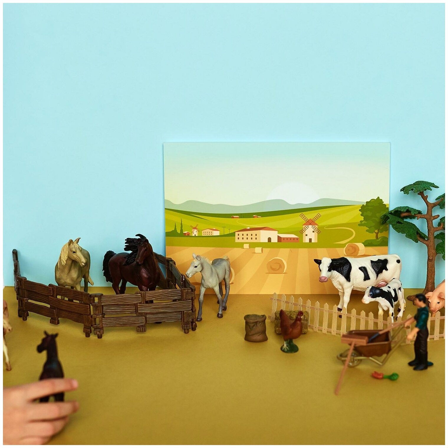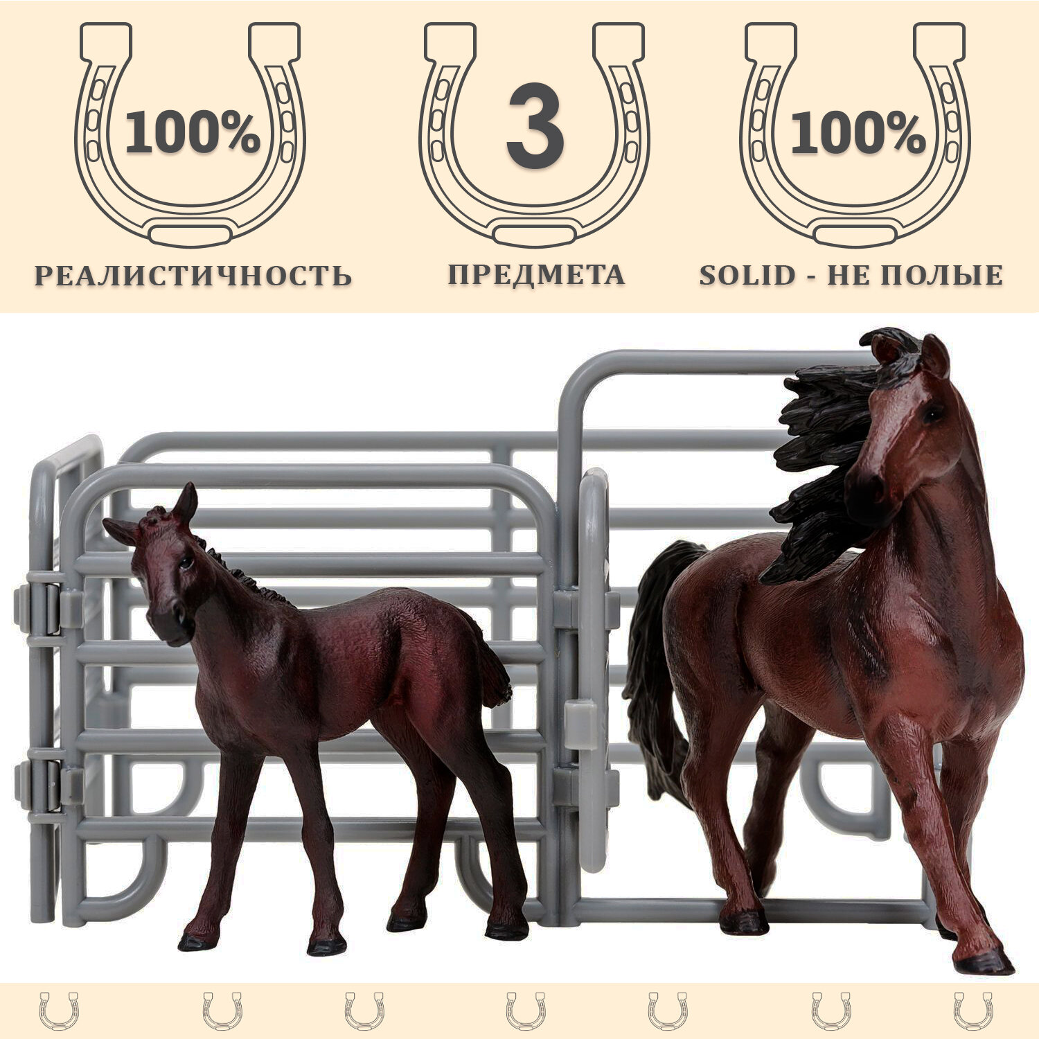 • В комплект входят: лошадь (16х3,5х12 см), жеребенок (9 х3х8 см), загон (10х15х15 см).