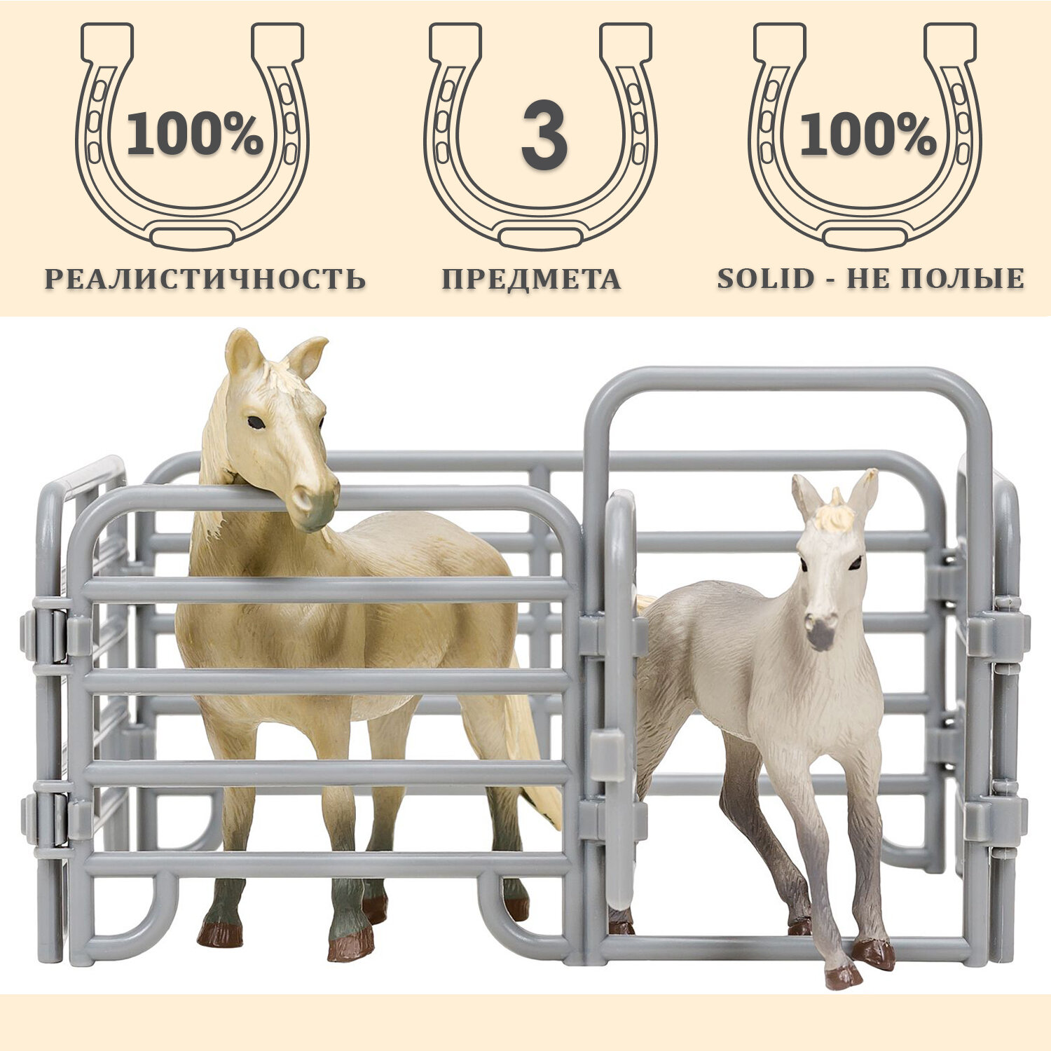 • В комплект входят: лошадь (10,5х6х11,5 см), жеребенок (10х3х8 см), загон (10х15х15).