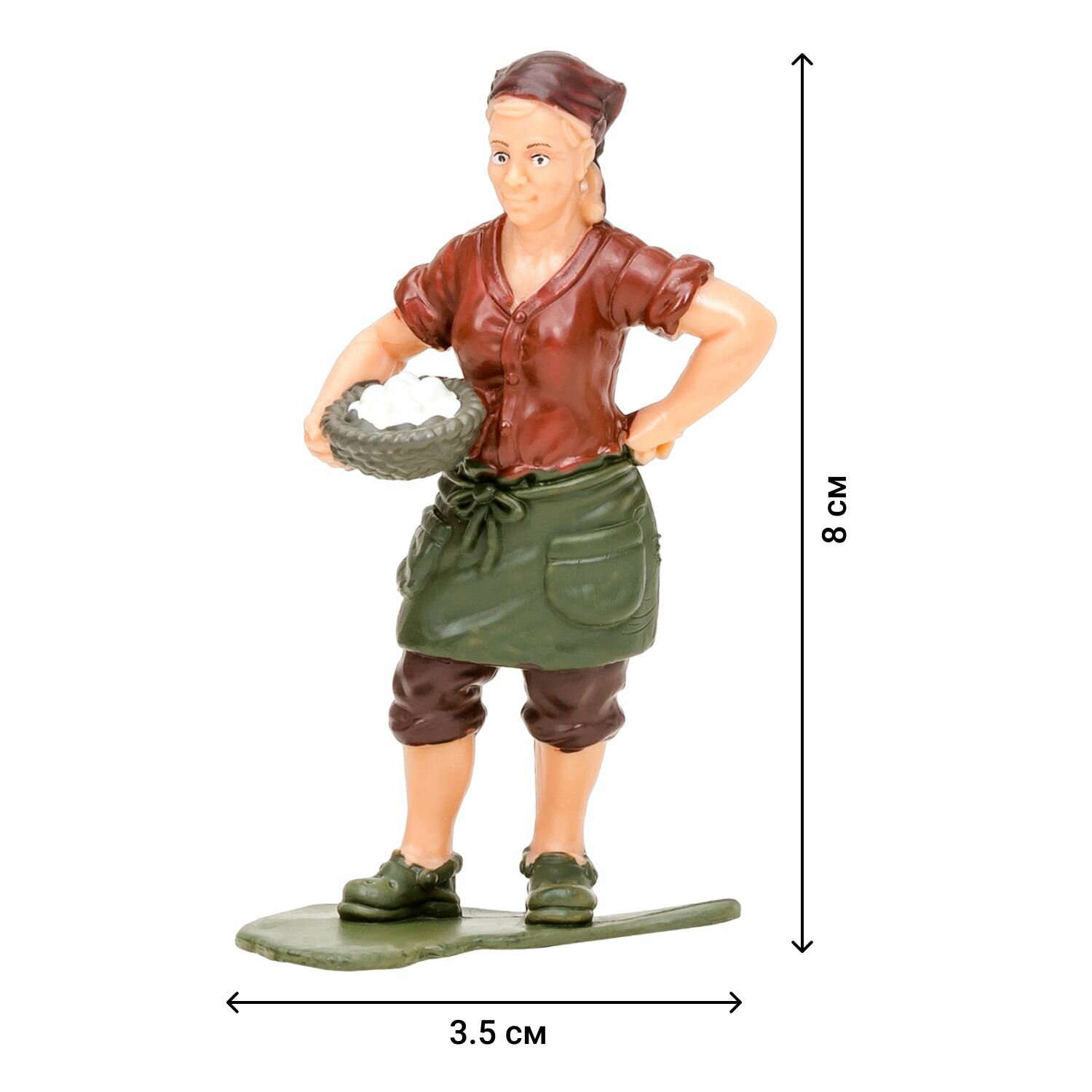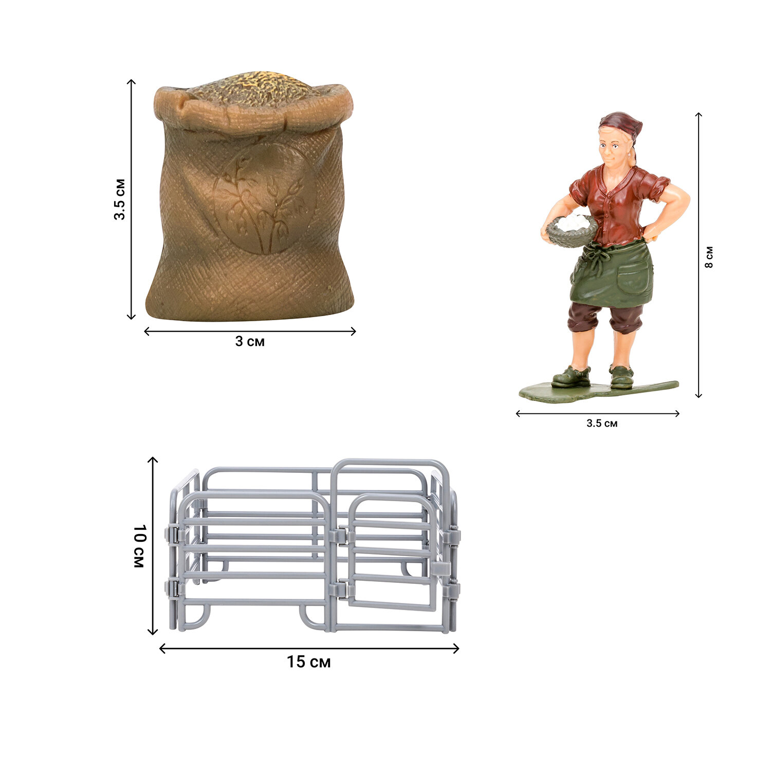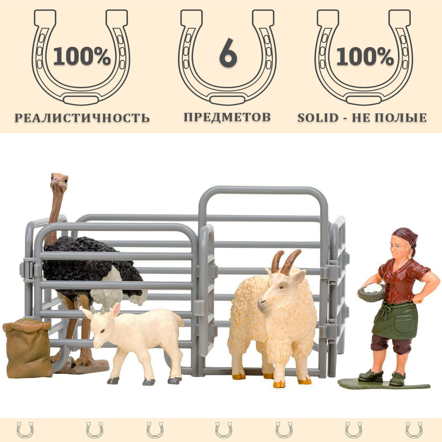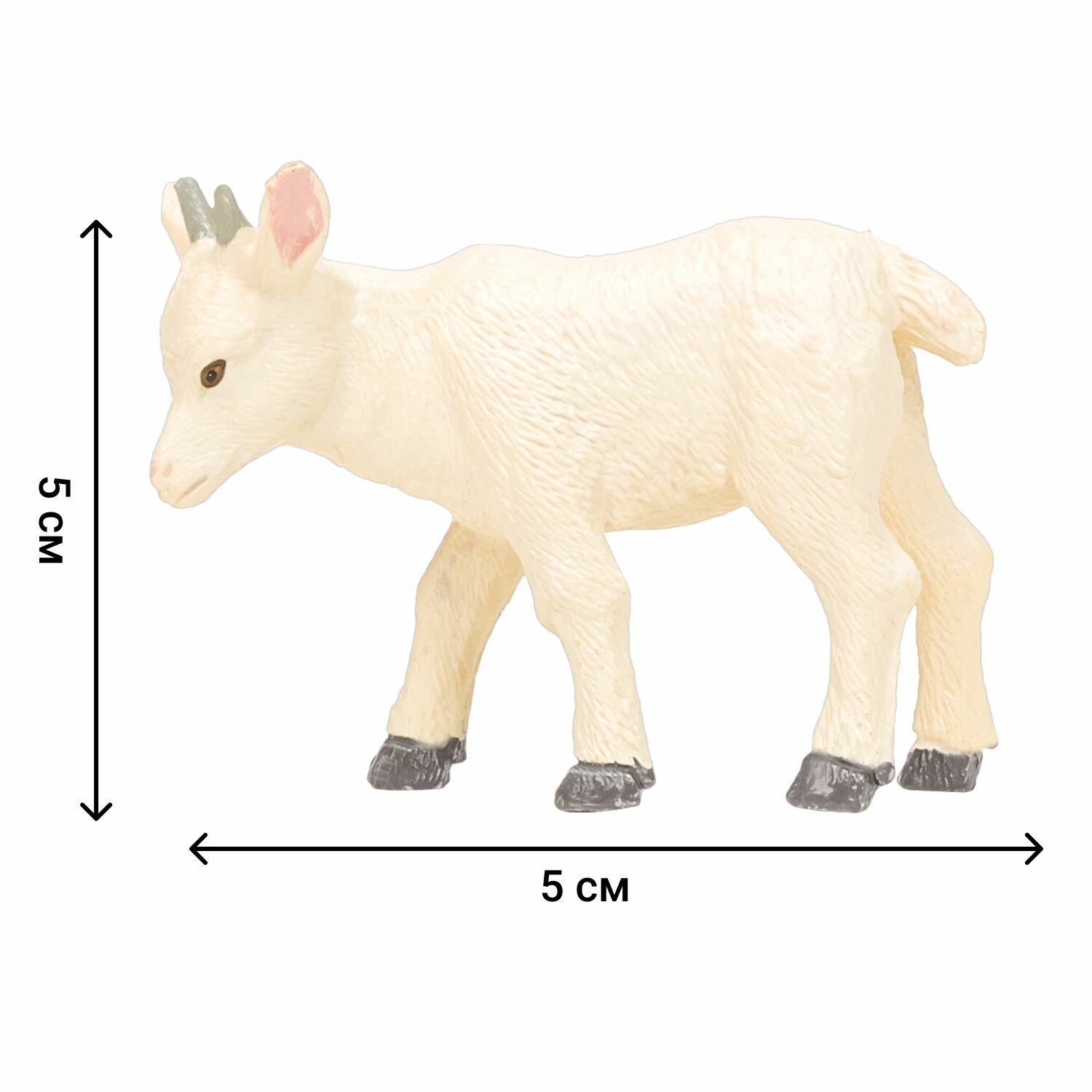 • В комплект входит 6 предметов: козел (10x2x7,5 см), козленок (5х2,8х5 см), страус (10,5х8,5х4,5 см), фигурка женщины (8х3,5х3,5 см), загон (10х15х15 см), мешок (3х3,5х2 см).