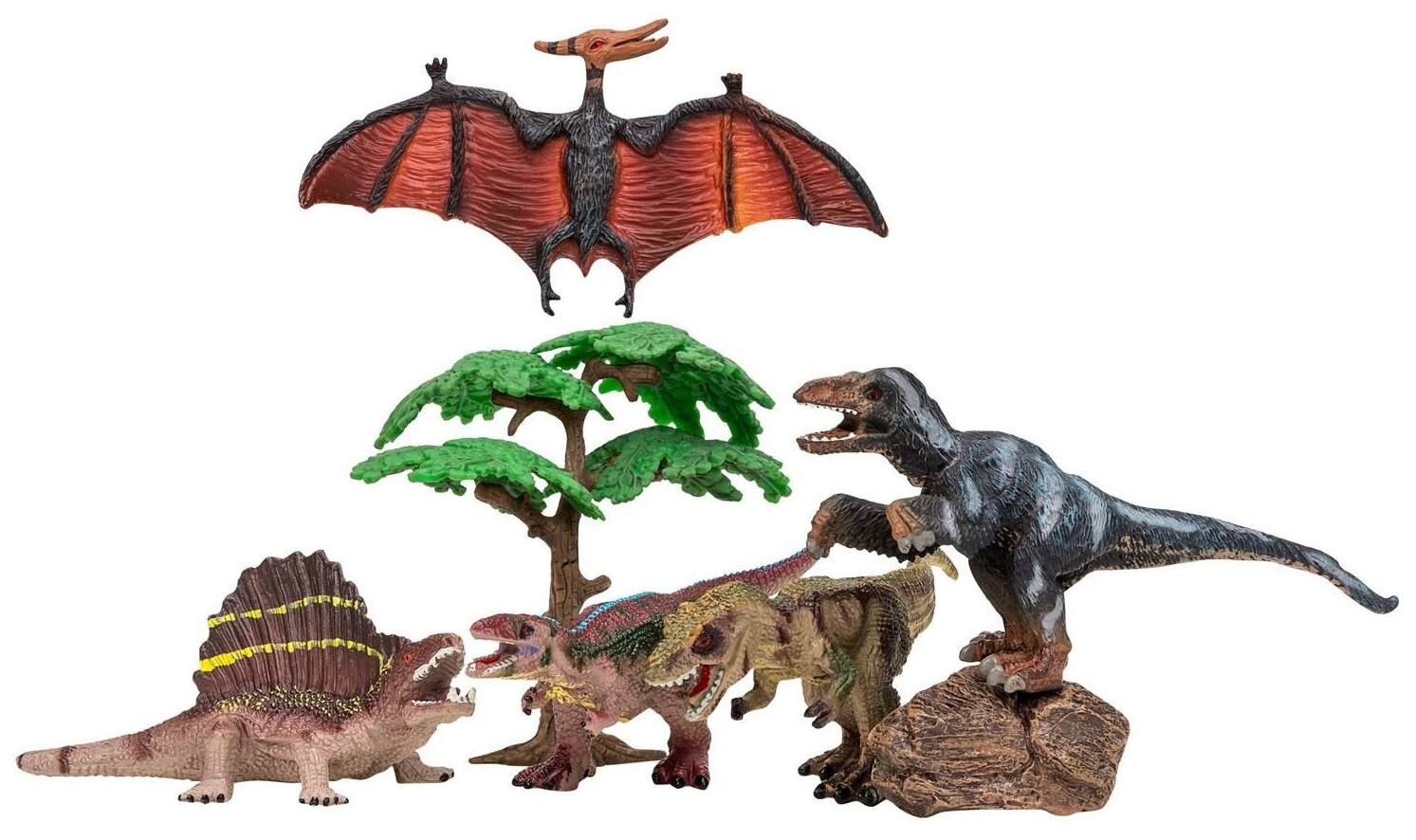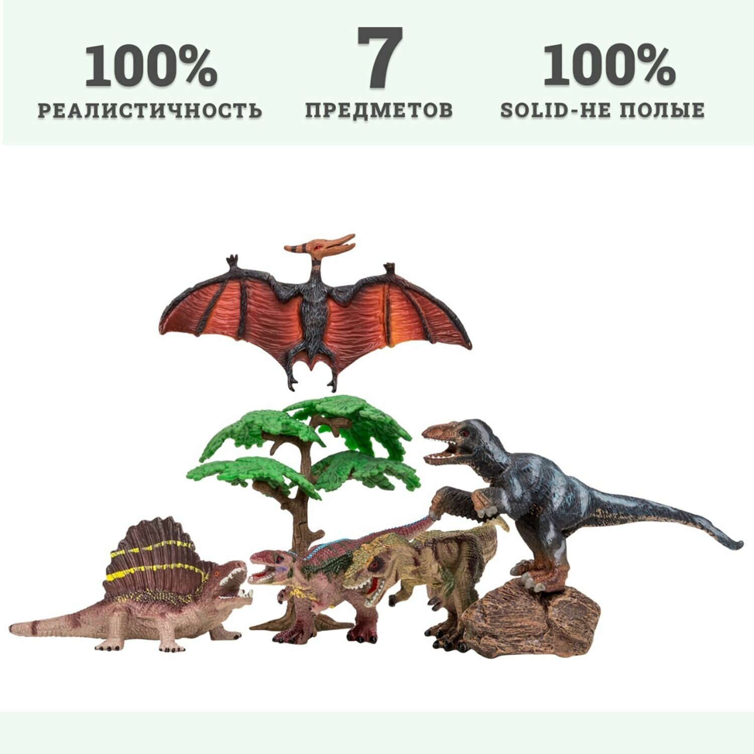 • В комплект входит 7 предметов: птеродактиль, диметродон, тиранозавр, троодон, велоцираптор, дерево, камень.