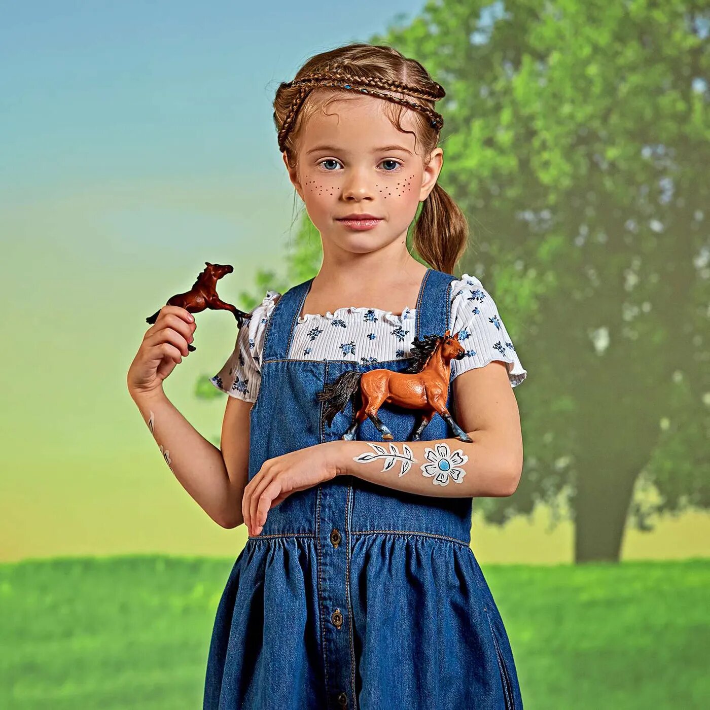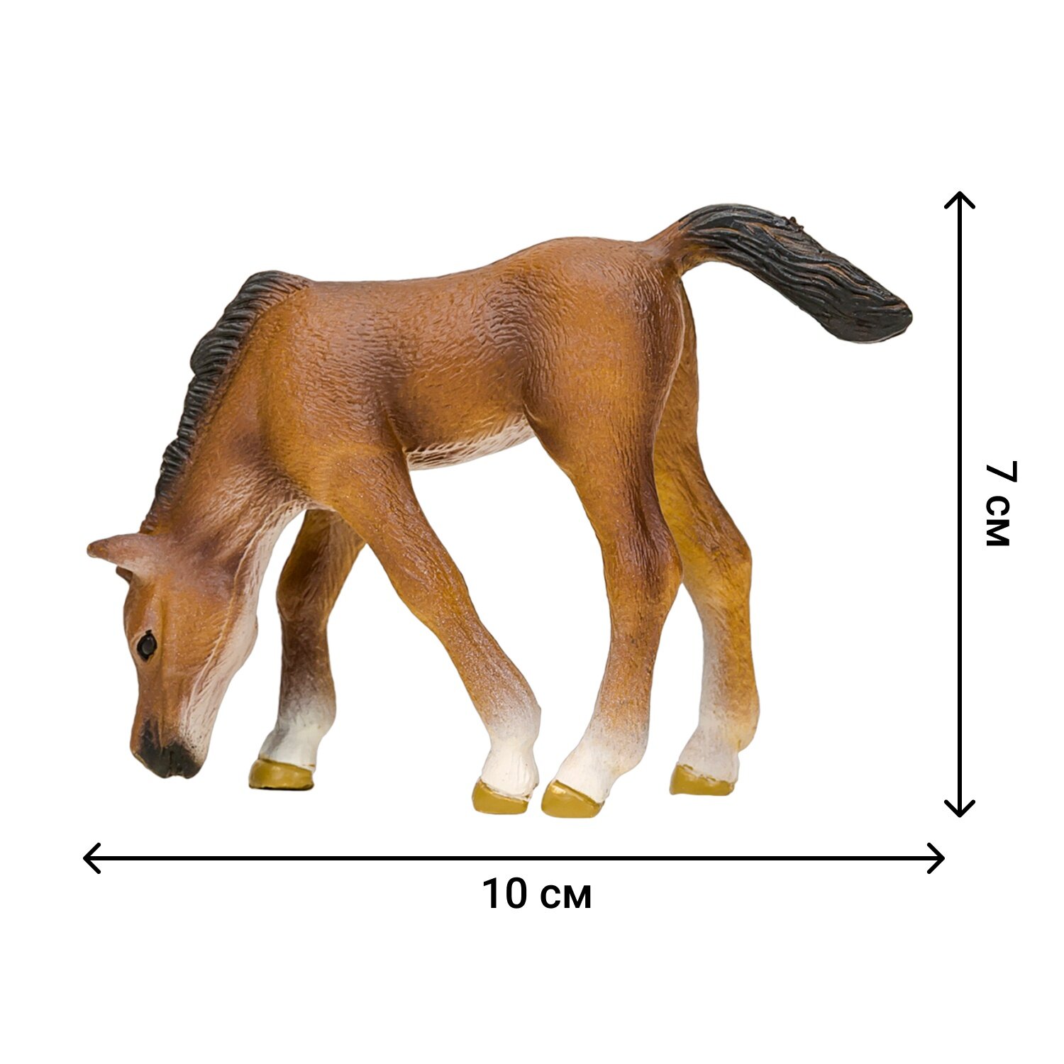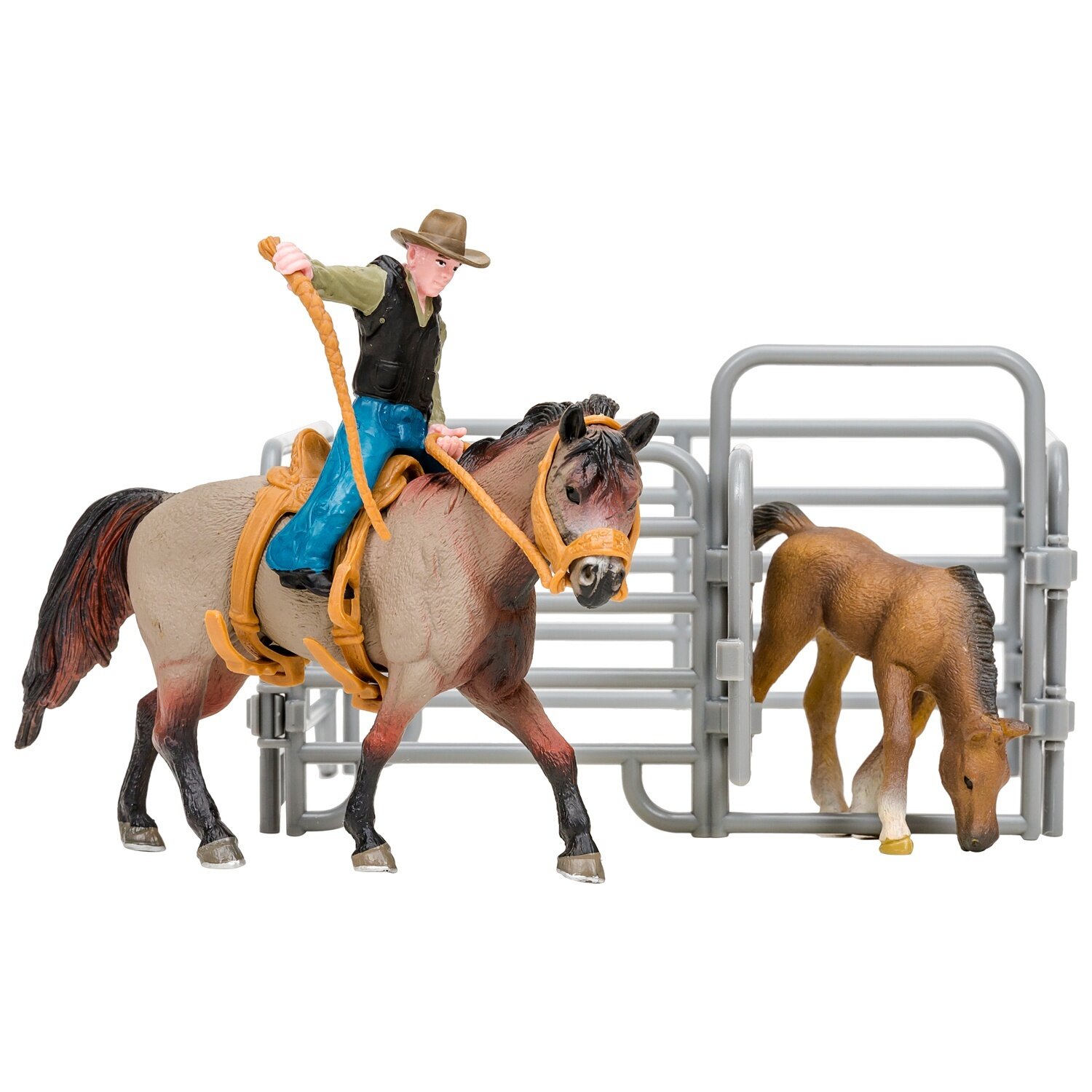 • В комплект входит 4 предмета: лошадь(17,5x3,5x10 см), жеребенок (10x3x7 см), фигурка фермера (8х3х3 см), загон (10х15х15 см).