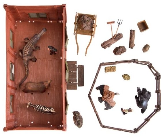 • В комплект входит 23 предметов: домик (48х28х30), ступеньки, загон (25х8), зебра (8х8х2), медведь (11х6,5х5), горилла (10,5х8,5х5,5), гриф (10х8х7), крокодил (13,5х2,5х6), фигурка фермера 2 шт. (3х6х3; 3х6х3), камень 3 шт. (4х3,3; 4х4; 3х3), бревно 2 шт. (8х3х3; 8х3х3), ящик (4х3,5х3,5), трава (3х2х2), мешок (3х3,5х2), сено (4х3х2), телега (13х8х5), щетка (5х3х0,5), вилы (5х1,5х0,5).