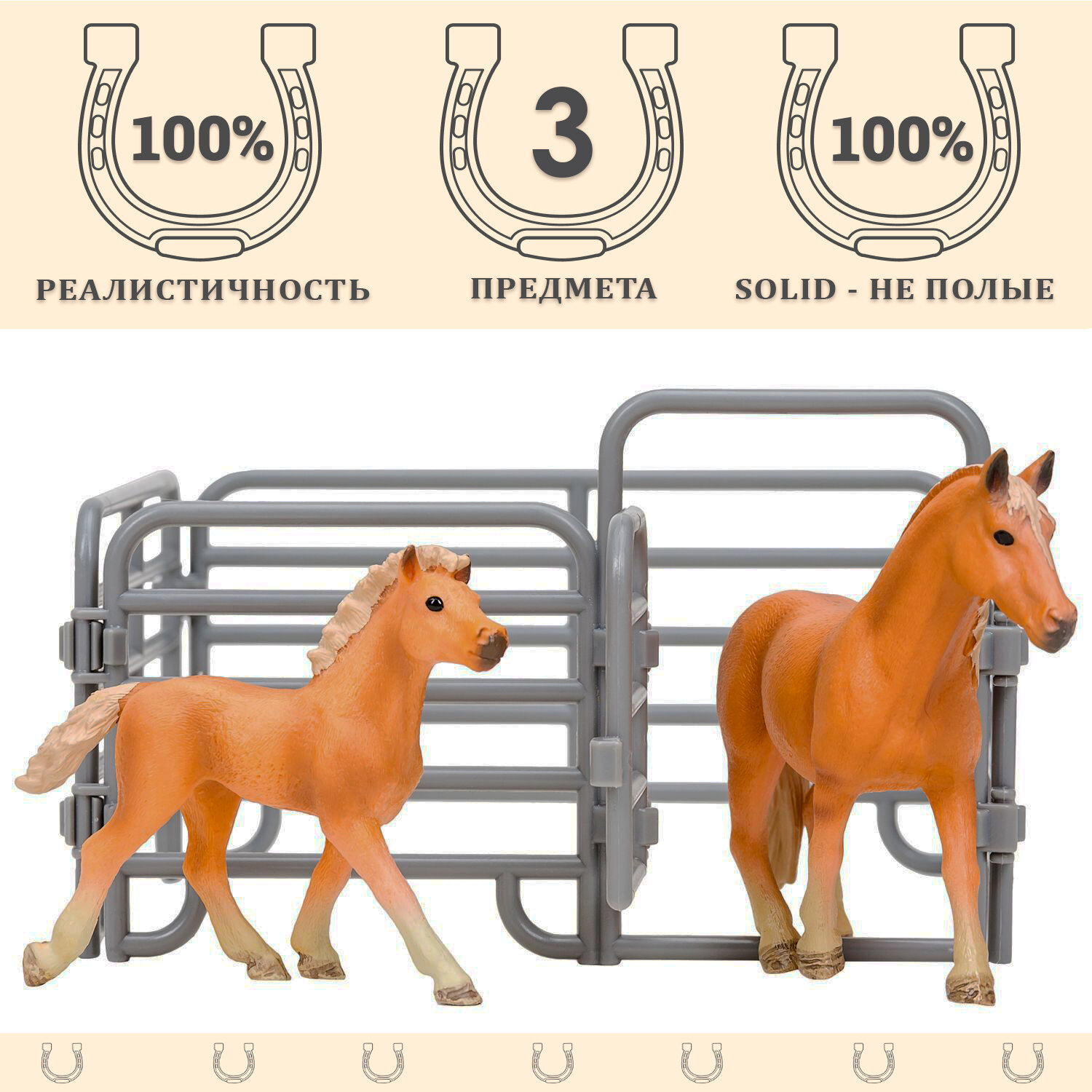 • В комплект входят: лошадь (13х3,5х10 см), жеребенок (9,5х3х8 см), загон (10х15х15 см).