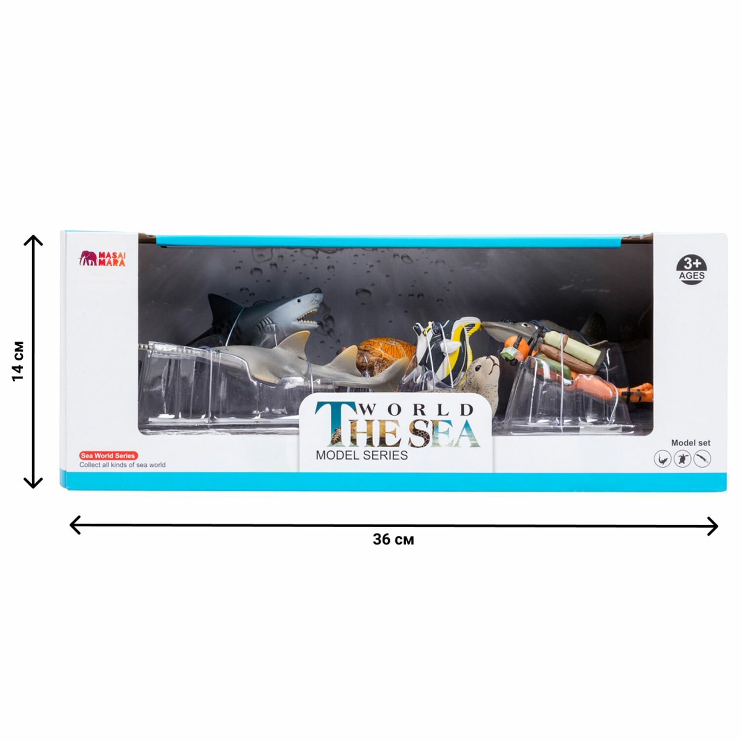 • В комплект входят: аакула (15х8,5х4 см), рыба-пила (17х5х3,8 см), морская черепаха (9,4х6,5х4 см), мавританский идол (6х2,5х6,5 см), тюлень (10,5х6,5х4,5 см), китовая акула (15х5х6 см), рохлевый скат (15х4х8,5 см), кошачья акула, дайвер (8х2,5х2,5 см).