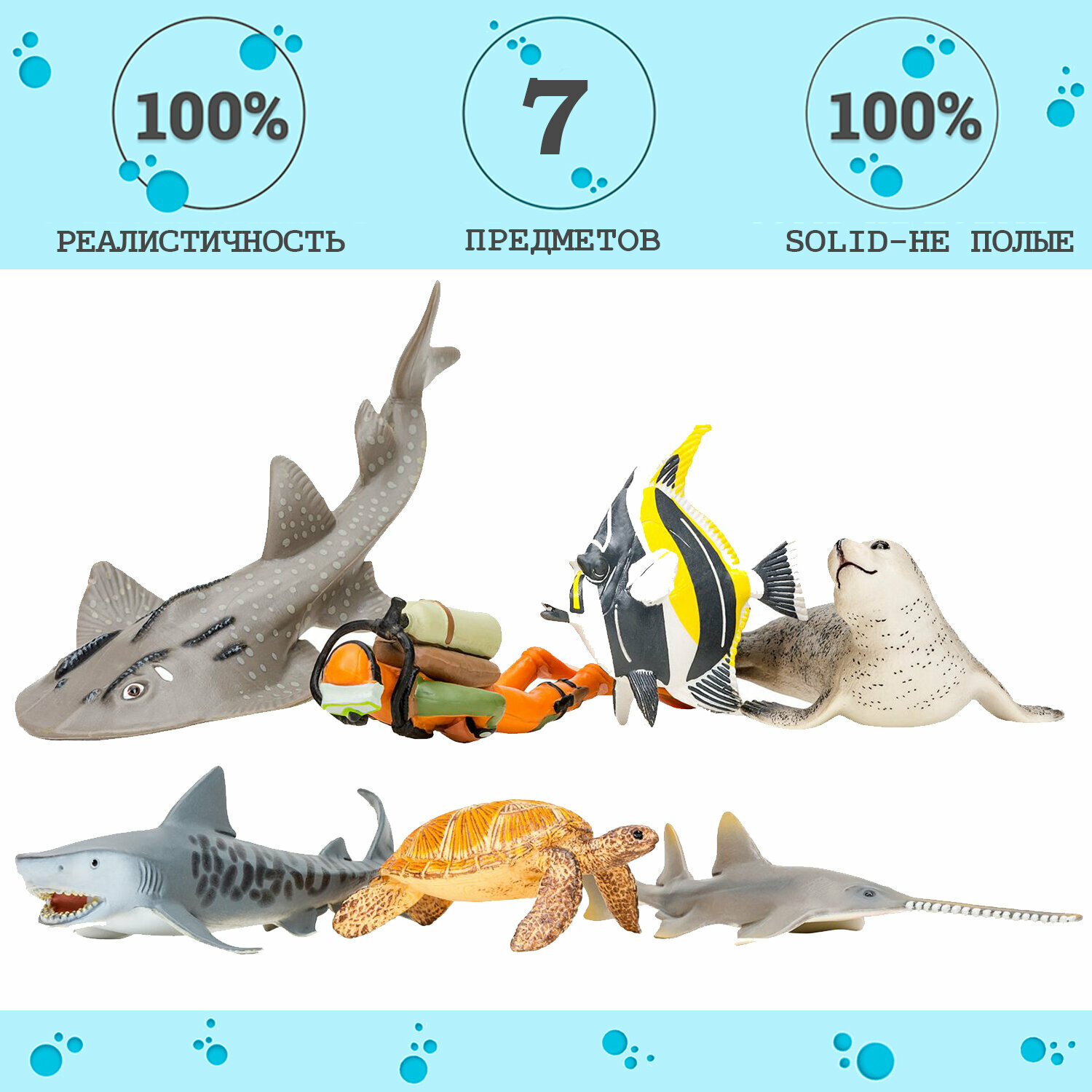 • Фигурки акулы, морской черепахи, мавританского идола, тюленя, китовой акулы, рохлевого ската, рыбы-пилы являются уменьшенными копиями реальных животных.