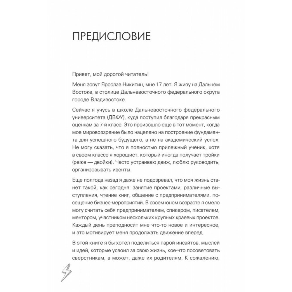 Ярослав Никитин - школьник, ставший предпринимателем в 15 лет. До переходного этапа он видел себя дипломатом, но однажды решил кардинально изменить свою жизнь. В книге описаны предпринятые шаги, которые способствовали трансформации автора, а также принципы и инструменты, применяемые им каждый день.