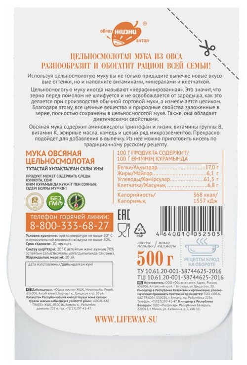 Мука Образ жизни Алтая овсяная цельносмолотая 500г