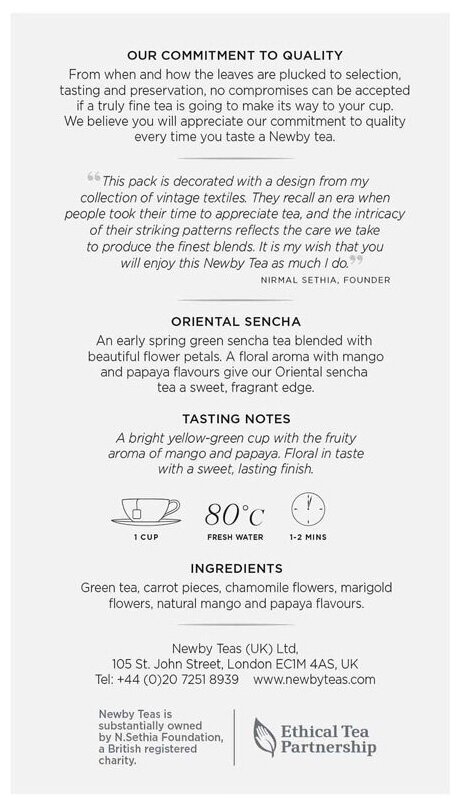 Зеленый чай с отборными лепестками цветов. Красивый цвет приятен для глаз, а изысканные ароматы стали прекрасным дополнением рисового вкуса чая Сенча. Цвет: ярко-желтый. Аромат: фруктовый. Вкус: цветочный, сладковатый. Послевкусие: долгое, сладковатое. Состав: зеленая сенча, кусочки моркови, цветы бархатцев, натуральный ароматизатор манго и папайи.