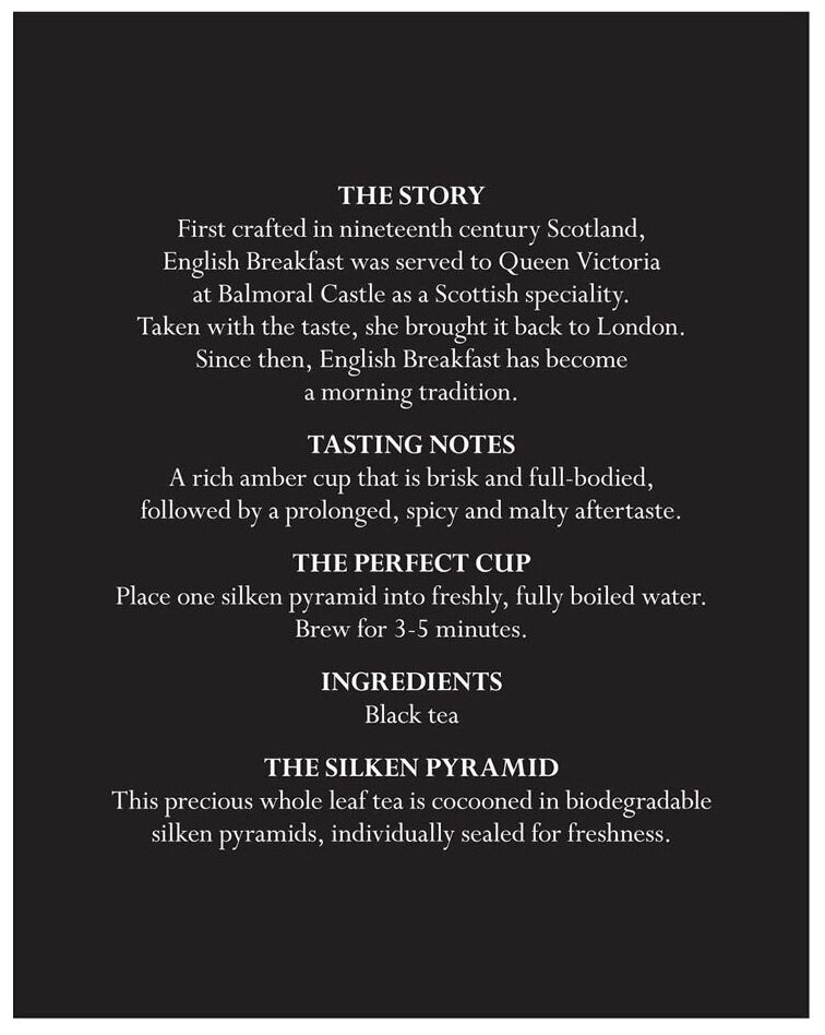 Чай Newby English Breakfast черный 15 пакетиков — это знаменитый купаж черного чая, созданный одной из лидирующих чайных компаний суперпремиального класса Newby. Процесс сборки листьев с лучших мировых плантаций осуществляется в самое благоприятное время чайного сезона. Основательный контроль на всех этапах производства и составление смесей высококлассными профессионалами, позволяют создавать изысканный бленд, покоривший множество ценителей бодрящего напитка. Newby English Breakfast идеален для утреннего пробуждения. Богатый, янтарный настой очаровывает своим глубоким вкусом с утонченными цитрусовыми нотками, солодовым ароматом и легким пряным послевкусием. Чашка великолепного чая подарит настоящее наслаждение, а также отличный заряд бодрости, позитива и тепла. Он станет прекрасным дополнением деловых встреч с важными клиентами, партнерами или дорогими гостями в офисном пространстве или в элитном салоне. Для приготовления роскошного напитка, залейте пакетик кипятком и настаивайте его 3-5 минут. Чайные листья закружатся в свободном пространстве шелковой пирамидки и отдадут самые яркие нотки вкуса и аромата, создавая глубокий и насыщенный настой. Свежесть и чистота изысканного чая будет радовать при каждом чаепитии, благодаря дополнительным многослойным фольгированным пакетам, в которые сложены пирамидки с чайным букетом. Они препятствуют попаданию посторонних запаха, влаги и воздуха, сохраняя первозданный вкус и аромат прекрасного бленда. Чай Newby English Breakfast рожден, чтобы покорять и очаровывать. Он займет почетное место в вашей чайной коллекции, а также принесет массу положительных эмоций, выступая в качестве искреннего презента для дорогих и важных вам людей. Состав: чай черный байховый. Способ приготовления: заварить чайную пирамидку в чашке или заварочном чайнике кипяченой водой и настоять 3-5 минут. Вес: 38 г. Количество пакетиков в упаковке: 15 штук по 2.5 г. Тип упаковки: картонная коробка. Условия хранения: хранить в чистом, хорошо вентилируемом помещении без посторонних запахов при относительной влажности воздуха не более 70%. Страна производства: Индия.