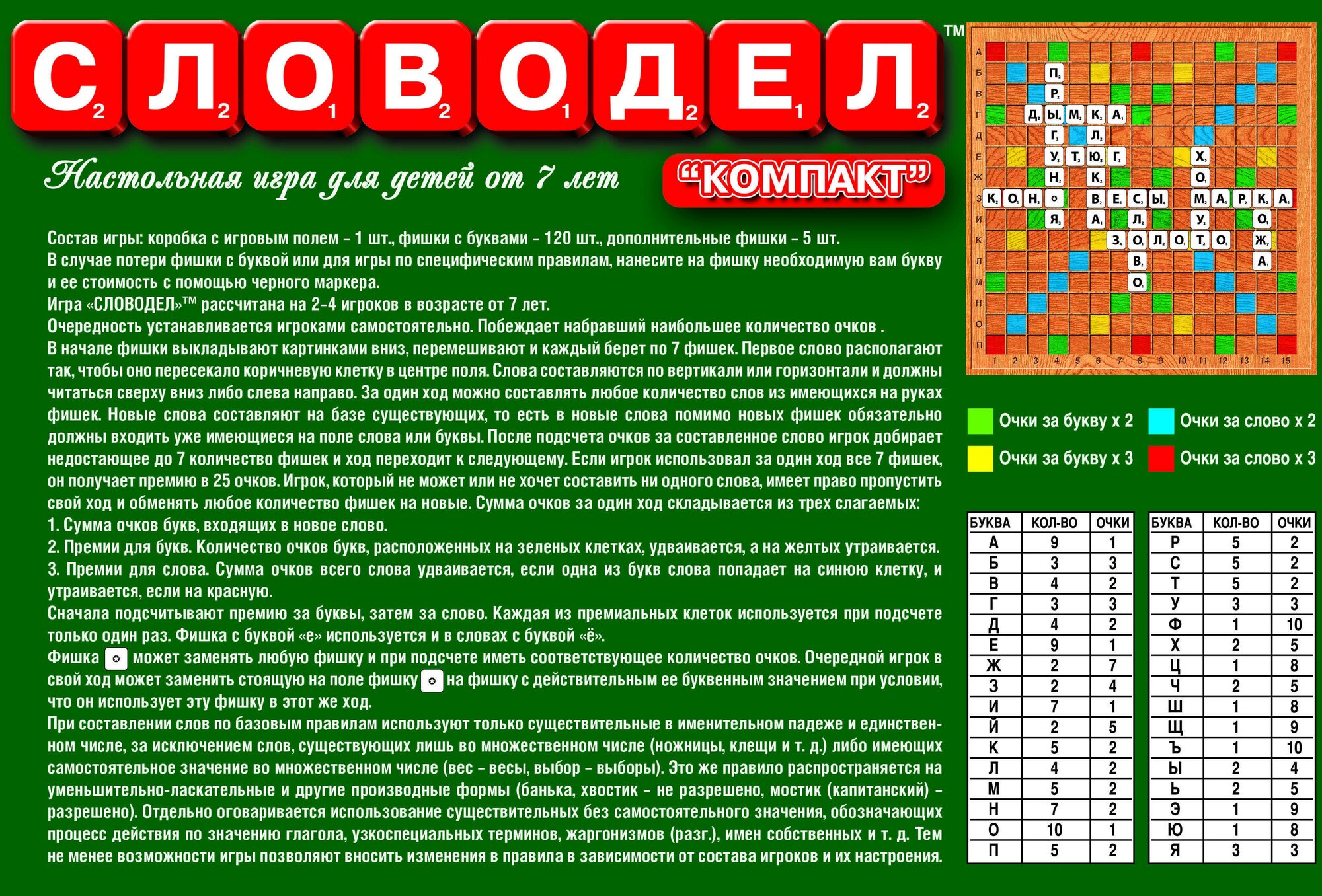 Игра "СЛОВОДЕЛ" рассчитана на 2-4 игроков в возрасте от 7 лет. Очередность хода устанавливается игроками самостоятельно. Побеждает игрок, набравший наибольшее количество очков. В начале игры фишки выкладываются картинками вниз, перемешиваются и каждый игрок берет по 7 фишек. Первое слово располагается так, чтобы оно пересекало коричневую клетку в центре поля. Слова составляются по вертикали или горизонтали и должны читаться сверху вниз, либо слева направо. За один ход можно составлять любое количество слов из имеющихся на руках фишек. Новые слова составляются на базе существующих, т.е. в новые слова помимо новых фишек обязательно должны входить уже имеющиеся на поле слова или буквы. После подсчета очков за составленное слово, игрок добирает недостающее до 7 количество фишек, и ход переходит к следующему игроку. Если игрок использовал за один ход все 7 фишек, он получает премию в 25 очков. Игрок, который не может или не хочет составить ни одного слова, имеет право пропустить свой ход и обменять любое количеств