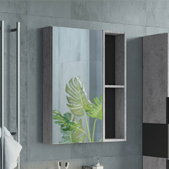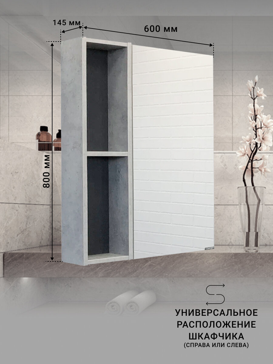 Высококачественное зеркальное полотно с амальгамой на основе серебра. Створка оснащена петлями с плавным закрыванием. Петли у створки снаружи. За зеркальной створкой две горизонтальные полки, в пространстве открытого хранения - одна. Зеркало-шкаф универсально - может быть подвешено в правом и левом варианте.