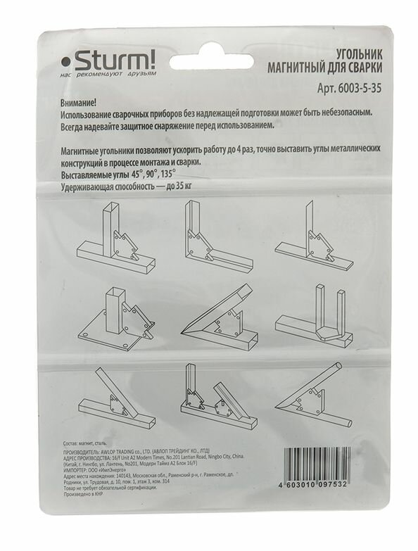 Угольник магнитный Sturm! используется при установки и фиксации деталей под заданным углом во время сварочных, монтажных работ. Заменяет струбцины и зажимы и позволяет обходиться без напарника.Магнитные угольники позволяют ускорить работу до 4 раз, точно выставить углы металлических конструкций в процессе монтажа и сварки.