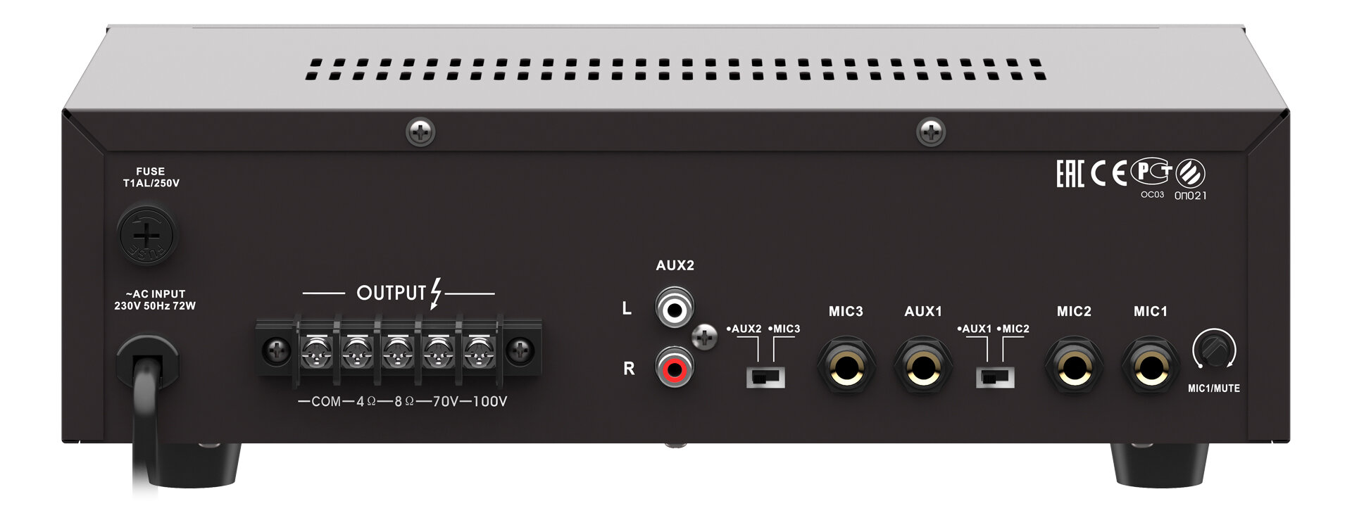 Усилитель имеет 3 микрофонных и 2 линейных входа с возможностью микширования. Линейные входы предусматривают подключение к ним стерео сигнала. Линейный выход стерео для подключения дополнительного усилителя или другого оборудования, например низкоомных акустических систем.