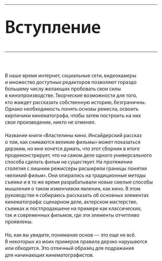Используя ключевые сцены из самых известных фильмов, Тим Грирсон исследует все: от кинематографии до секретов общения с камерой. Например, понятие "большая глубина резкости" он объясняет через "Гражданина Кейна", форсированную перспективу - через "Эльфа", а замедленную съемку через сцены из "Бешеных псов". Примеры из блокбастеров ("Чудо-женщина") и лауреатов "Оскара" ("Рокки"), жемчужин эпохи немого кино ("Нетерпимость") и недавних сокровищ арт-хауса ("Американский мед") дают читателям представление о широте и потенциале кинематографа.