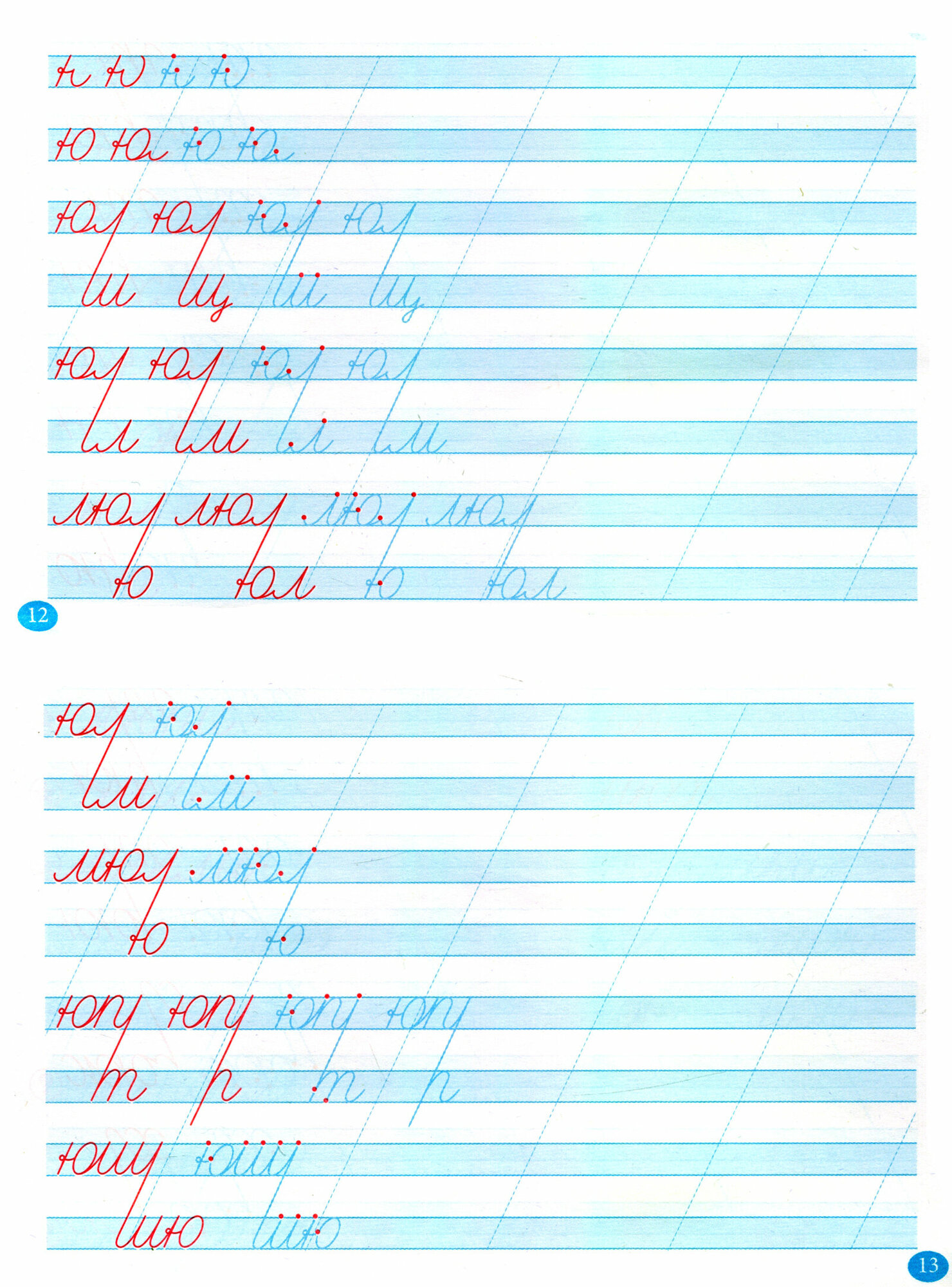 В начале страницы даны образцы букв; буквы в бледном начертании нужно обвести, дописать до конца строки. У букв, начертанных бледно, поставлены точки (выделено начало начертания или места для остановки руки). Цветная рабочая строка позволяет лучше видеть границы рабочего поля.