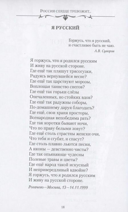 Известный поэт и историк Сергей Дмитриев, представляя в семитомном проекте свое многолетнее поэтическое творчество, в новой книге "Россия сердце тревожит… Стихи о России и поэзии" собрал в единую летопись протяженностью более четверти века свои стихотворения о России, ее тысячелетней истории, родной природе и временах года, а также о феномене поэзии и великих русских поэтах, по следам которых автор странствует долгие годы.