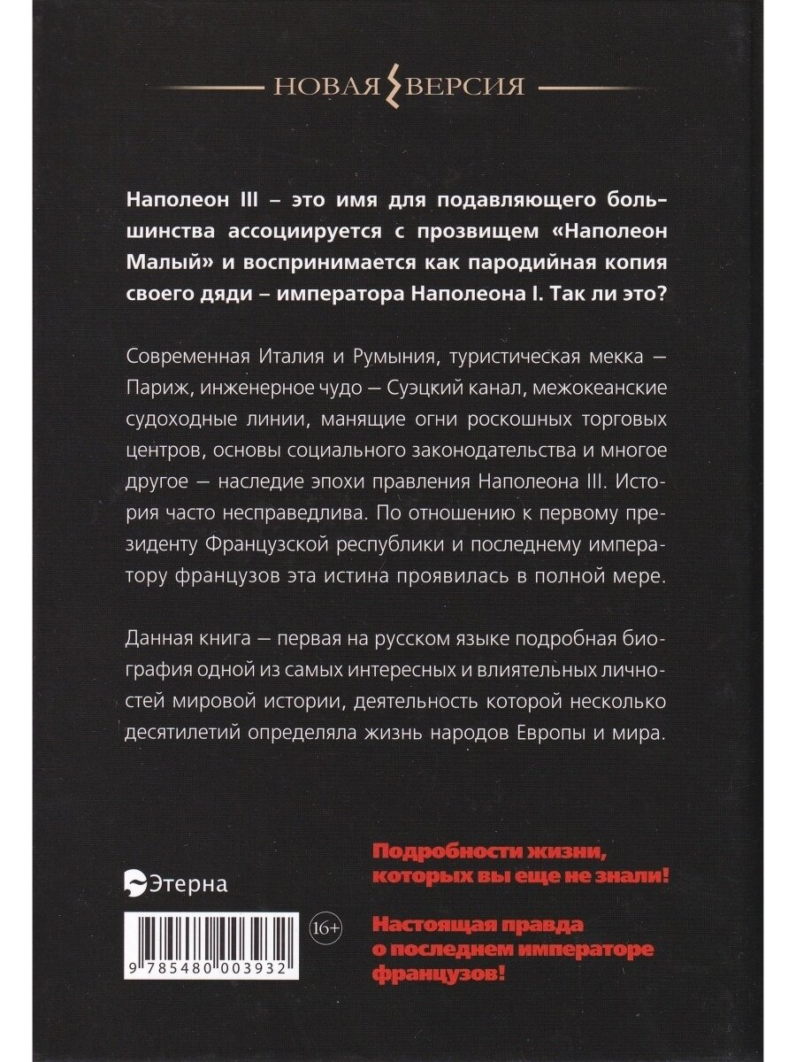 Несколько лет назад я впервые посетила Францию и была приятно поражена архитектурным обликом Парижа, который был значительно перестроен в середине XIX века. Захотелось узнать больше подробностей о том времени, но к своему удивлению обнаружила, что соответствующих книг на русском языке практически нет. Поэтому приобрела издание о Наполеоне III. Впечатление – достойное и обстоятельное исследование. Читается с интересом и легко. Держит внимание до последней страницы. Оказывается, что при «незадачливом» правлении «авантюриста» Наполеона III проводились реформы, развивалась промышленность, строились дороги, создавались рабочие места, повышалось благосостояние населения. Вызывает чувство уважения. А перипетии личной жизни императора, его супруги и их сына вообще достойны отдельного киноромана. Итог прочитанного: делать собственные выводы, а не жить слепо в мире мифов и сказок. Огромное спасибо автору, издательству и магазину Лабиринт.