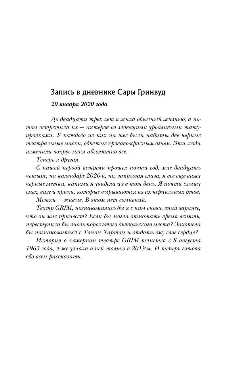 До двадцати трех лет Сара Гринвуд, бакалавр факультета журналистики, жила обычной жизнью, а потом встретила их - актеров театра "GRIM" со зловещими уродливыми татуировками. У каждого из них на шее были набиты две черные театральные маски, объятые кроваво-красным огнем. И они были словно живыми…