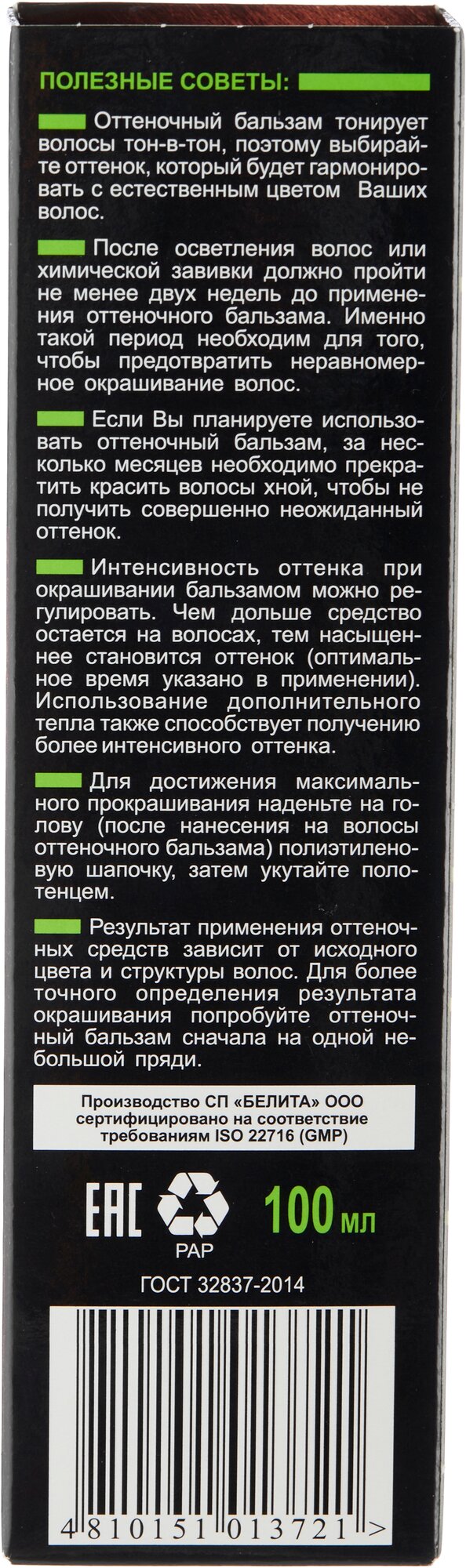 | Способ применения | наденьте перчатки, накройте плечи полотенцем. Аккуратно, стараясь не попадать на кожу лица и шеи, нанесите оттеночный бальзам-маску на предварительно вымытые и высушенные волосы, распределите по всей длине, расчешите. Выдержите 30 минут, тщательно промойте волосы |