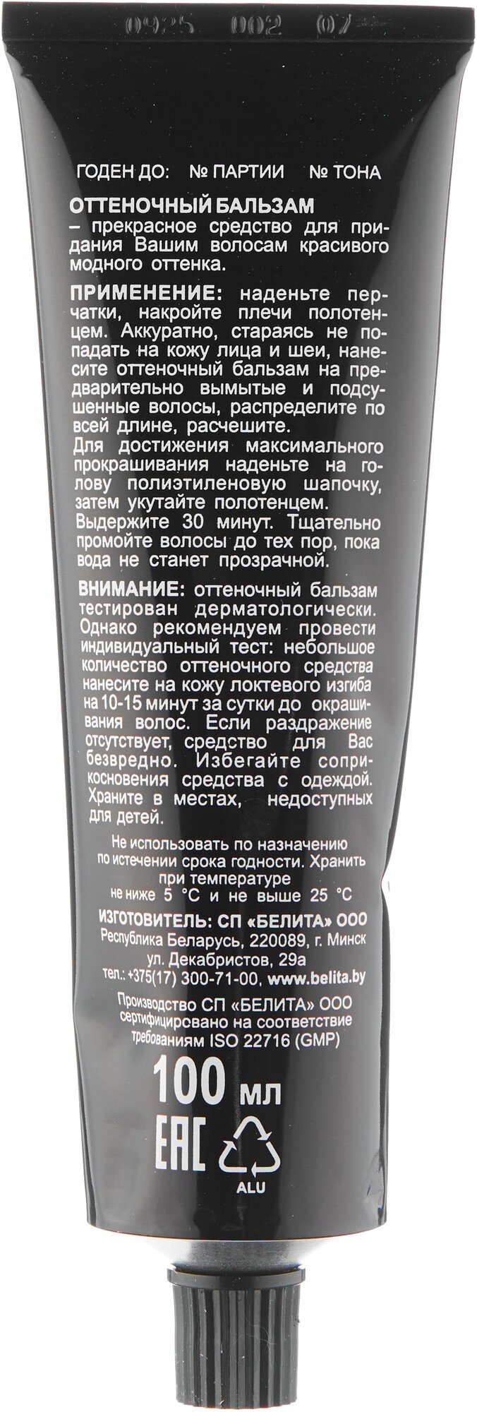| Способ применения | наденьте перчатки, накройте плечи полотенцем. Аккуратно, стараясь не попадать на кожу лица и шеи, нанесите оттеночный бальзам-маску на предварительно вымытые и высушенные волосы, распределите по всей длине, расчешите. Выдержите 30 минут, тщательно промойте волосы |