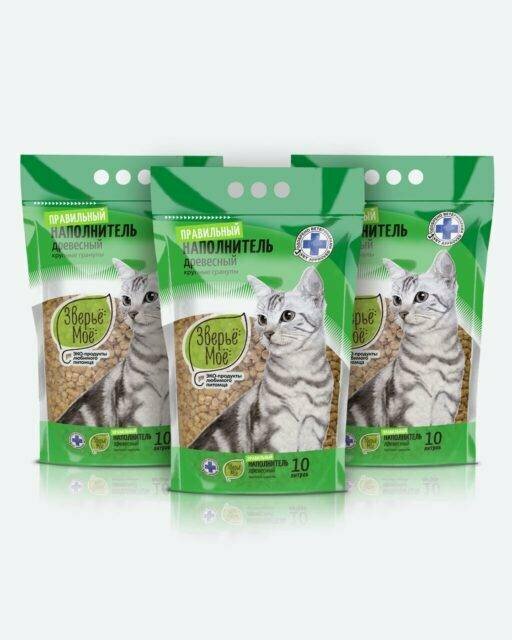 Древесные наполнители для кошек и котят, кроликов, морских свинок, хомяков, крыс и других грызунов "Зверьё Моё" производятся только из специально отобранной, тщательно просушенной, измельченной и спрессованной древесины хвойных пород. В производстве исключено использование топливных гранул. Натуральные, только эко-сырье, впитывают в 3 раза больше собственного веса, запирают запахи, бактерицидные, не пылят, не прилипают к шерсти и лапам, безопасны при попадании в желудок, гипоаллергенны, легко утилизируются в унитаз