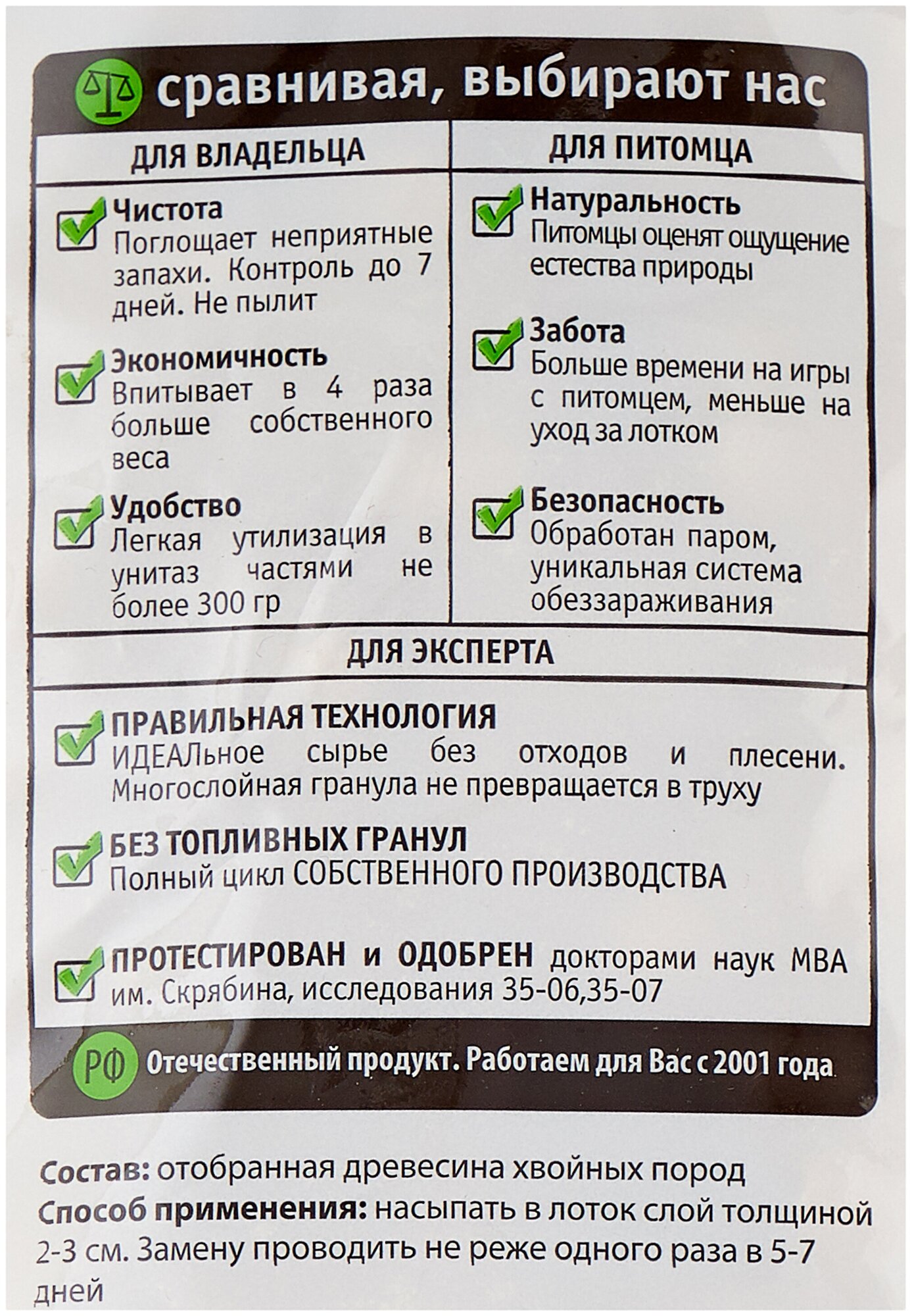 Крупные гранулы медленнее распадаются на опилки. Запах поглощает замечательно. Опилки можно смывать в унитаз. Доступная цена.