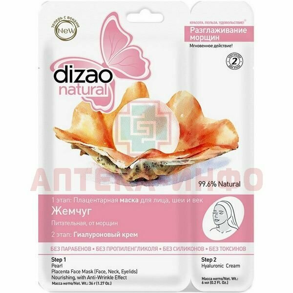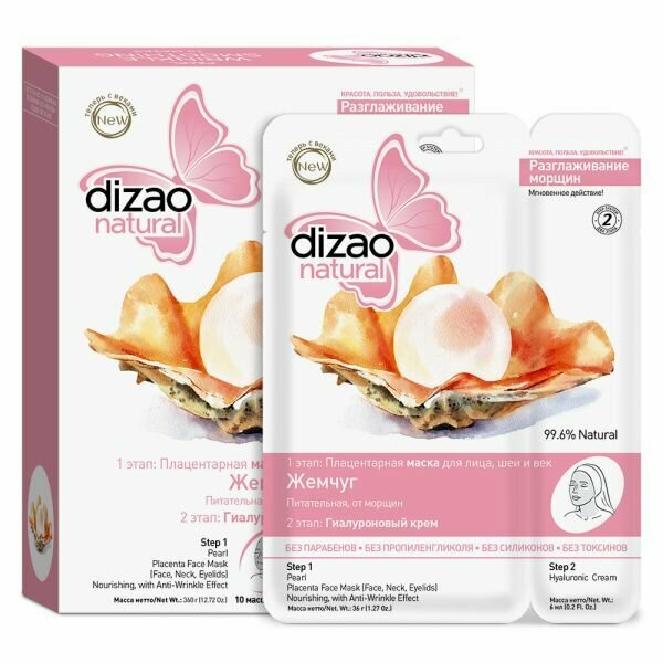 Маска Dizao включает в себя двухэтапный уход за кожей лица, шеи и век. Жемчужная пудра, входящая в состав маски, содержит 22 вида аминокислот, основного материала для создания новых здоровых клеток, 18 микроэлементов, глюкозу, укрепляющую мышцы лица, протеины и витамины В и D. Уже после ппервого применения маски заметен результат. Оказывает мощный лифтинг- эффект, повышает тонус кожи, придавая ей жизненную силу и сияние. Разглаживает уже имеющиеся и профилактирует появление новых морщин. Глубоко увлажняет и питает, отбеливает пигментные пятна. Восстанавливает эластичность, придает коже матовость и шелковистость.