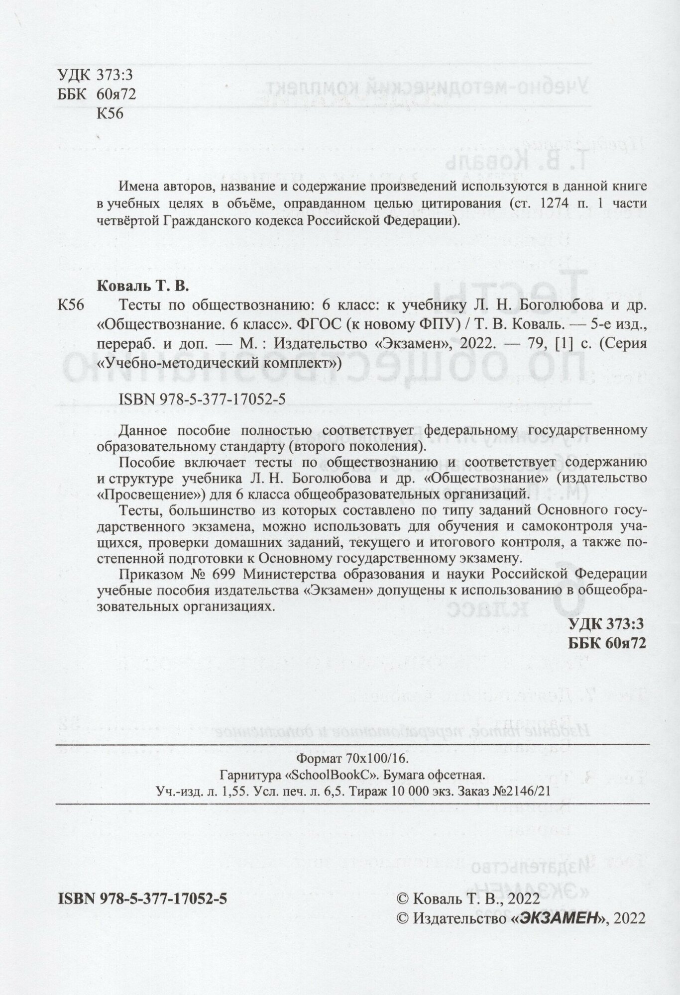 Тесты по обществознанию К учебнику Л М Боголюбова и др Обществознвние 6 класс (Коваль Татьяна Викторовна); Экзамен Издательство, 2022