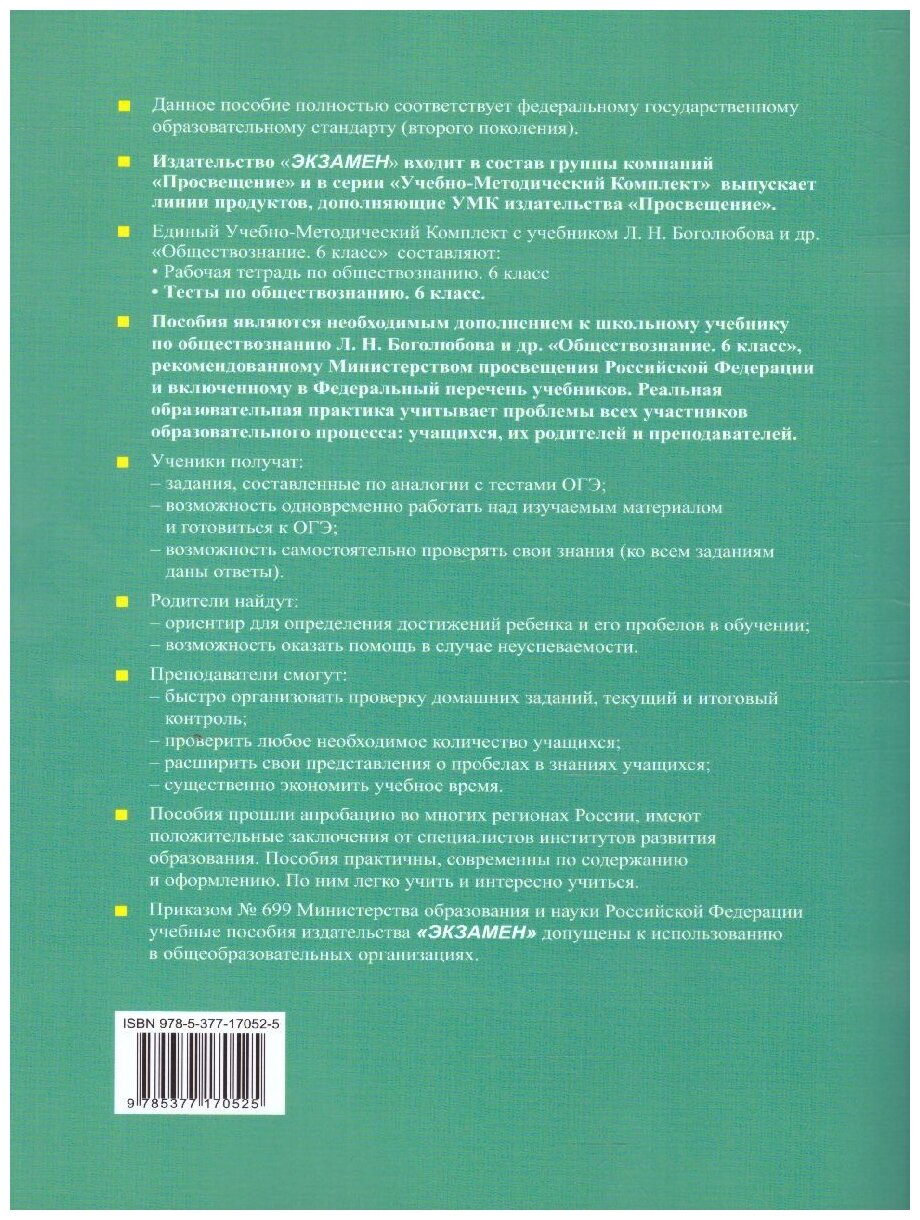 Пособие включает тесты по обществознанию и соответствует содержанию и структуре учебника под редакцией Л. Н. Боголюбова, Л. Ф. Ивановой "Обществознание" (издательство "Просвещение") для 6 класса общеобразовательных организаций.