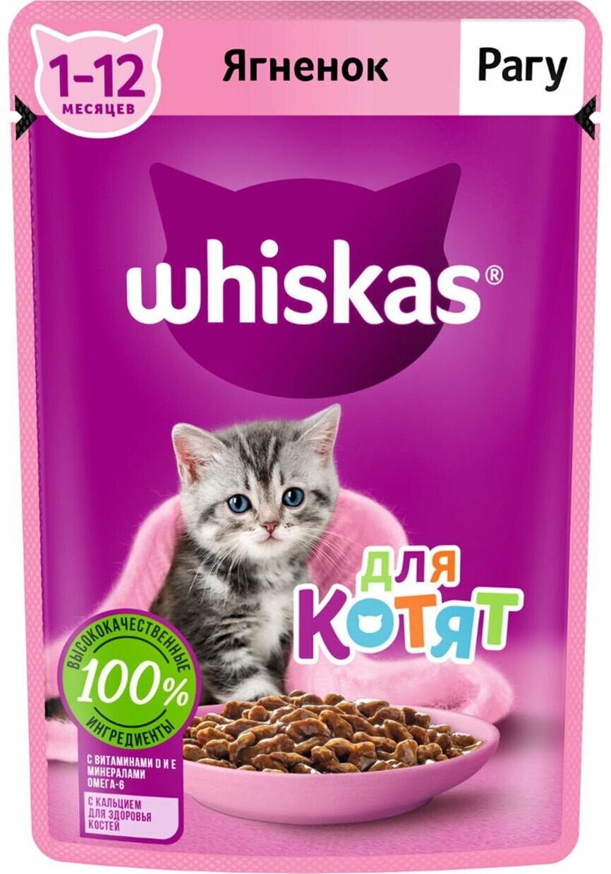 " Рацион Whiskas® для котят "" Рагу с ягненком"" — это сбалансированный рацион для здорового роста вашего малыша. Котенок с удовольствием попробует маленькие нежные кусочки с ягненком в ароматном соусе. Все для замурррчательной жизни! Рационы Whiskas® для котят позаботятся об иммунитете, поддержат здоровое пищеварение и обеспечат здоровый рост и развитие. Котята активно растут и с первых дней нуждаются в правильном питании. Корм Whiskas® для котят создан с учетом всех особенностей развития организма котенка. • Для здорового роста и правильного развития корм Whiskas® для котят содержит оптимальное сочетание питательных веществ, витаминов и минералов. Содержит: • 100% натуральные высококачественные ингредиенты: мясо и субпродукты – без добавления ароматизаторов, искуственных красителей и консервантов. • Кальций для здоровья костей • Омега-6 и цинк для здоровья кожи и шерсти • Витамин А и таурин для хорошего зрения • Витамины D, E и минералы Ваш котенок будет мурчать от удовольствия! Рекомендации по кормлению Очень важно правильно кормить котенка уже с рождения: • 3 месяца. Желудок котенка не больше наперстка, поэтому его нужно кормить понемногу и часто 4–5 раз в день. • 6 месяцев. Хотя по размеру котенок приближается к взрослой кошке, он все еще нуждается в специальном питании для котят. Его нужно кормить 2–3 раза в день в одно и тоже время. • 10 месяцев. Котенок почти взрослый. В его меню можно вводить сухие и влажные рационы Whiskas® для взрослых кошек. WHISKAS® рекомендует сочетать разные форматы корма вашего малыша с самого раннего возраста. Утром и вечером нужно давать влажный рацион, а в течение дня — сухой. Это позволит объединить преимущества обоих типов корма. Нужно помнить, что смешивать в одной миске сухой и влажный рационы не рекомендуется. Кроме того, у котят всегда должен быть доступ к чистой питьевой воде."