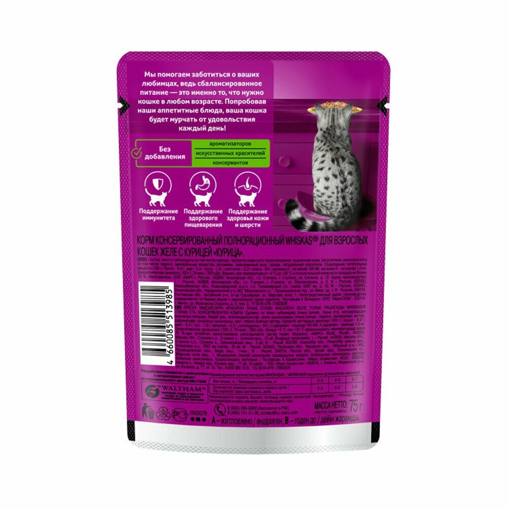 Это сбалансированный рацион, приготовленный именно так, как любит ваша кошка. Отборные мясные кусочки с курицей в аппетитном желе придутся по вкусу вашей любимице. Жизнь замурррчательна, ведь рацион Whiskas® содержит все необходимое, чтобы еда вашей кошки была не только вкусной, но и полезной. Whiskas® поддержит иммунитет, позаботится о здоровом пищеварении и здоровье кожи и шерсти вашей кошки. Подходит для стерилизованных котов и кошек. Рационы Whiskas® для взрослых кошек это: • 100% натуральные высококачественные ингредиенты: мясо и субпродукты – без добавления ароматизаторов, искусственных красителей и консервантов. • Оптимальный баланс питательных веществ для полноценной жизни • Все необходимое для поддержания здоровья вашей любимицы: Омега-6, кальций, фосфор и таурин, витамин D и Е, цинк. Ваша кошка будет мурчать от удовольствия! WHISKAS® рекомендует сочетать разные форматы корма в рационе вашей кошки. Утром и вечером вашей любимице нужно давать влажный рацион, а в течение дня — сухой. Такой тип питания позволит объединить преимущества каждого из форматов.Преимущества сухих рационов: • Профилактика заболеваний ротовой полости • Профилактика заболеваний желудочно-кишечного тракта Преимущества влажных рационов: • Профилактика ожирения • Профилактика заболеваний мочевыводящей системы Нужно помнить, что смешивать в одной миске сухой и влажный рационы не рекомендуется. Кроме того, у вашей любимицы всегда должен быть доступ к чистой питьевой воде. Хранить при температуре от +4 *С до +35 *С и относительной влажности воздуха не более 75 %.